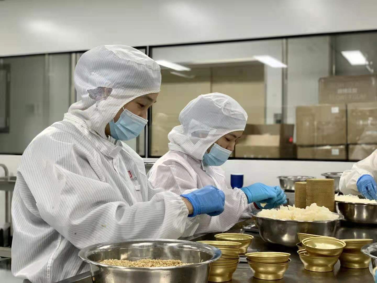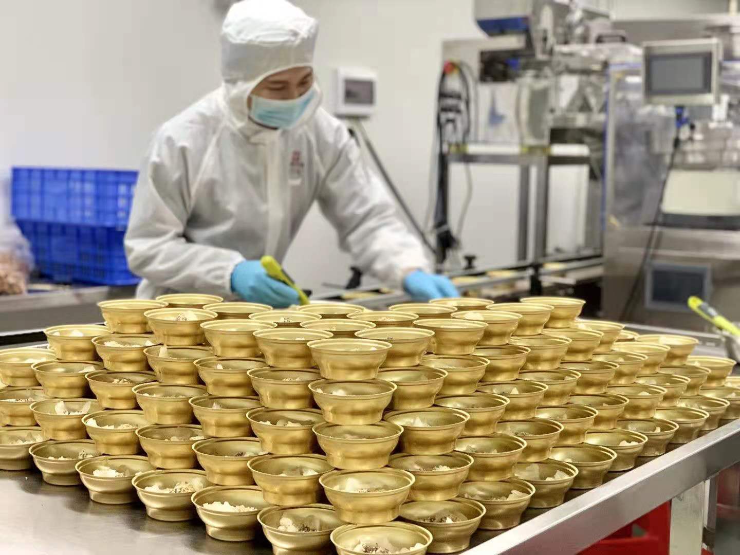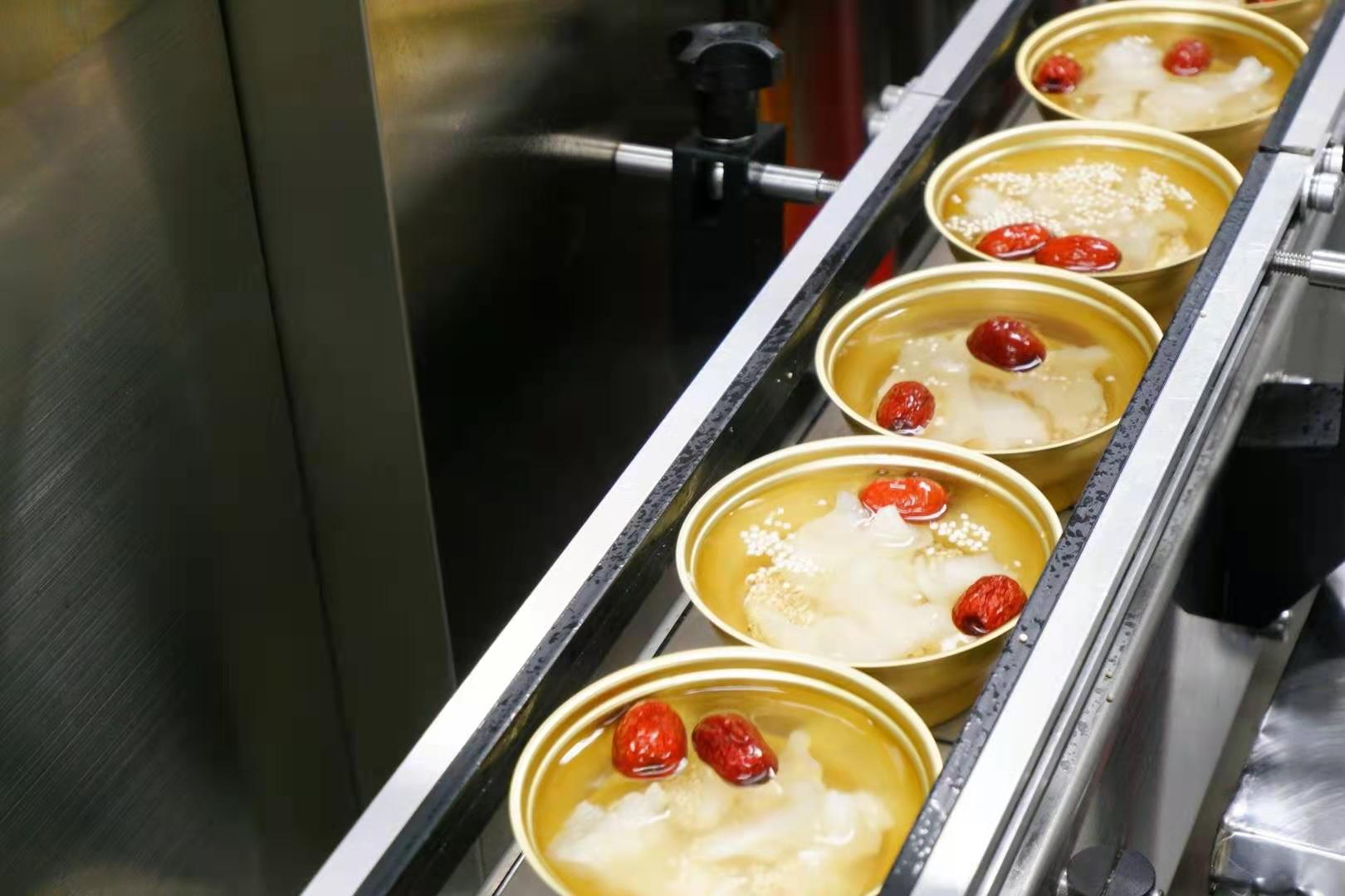 原料循环清洗-->蒸煮泡发-->12小时去腥-->洗罐-->称重-->装罐-->加汤-->封罐-->121度精准炖煮杀菌