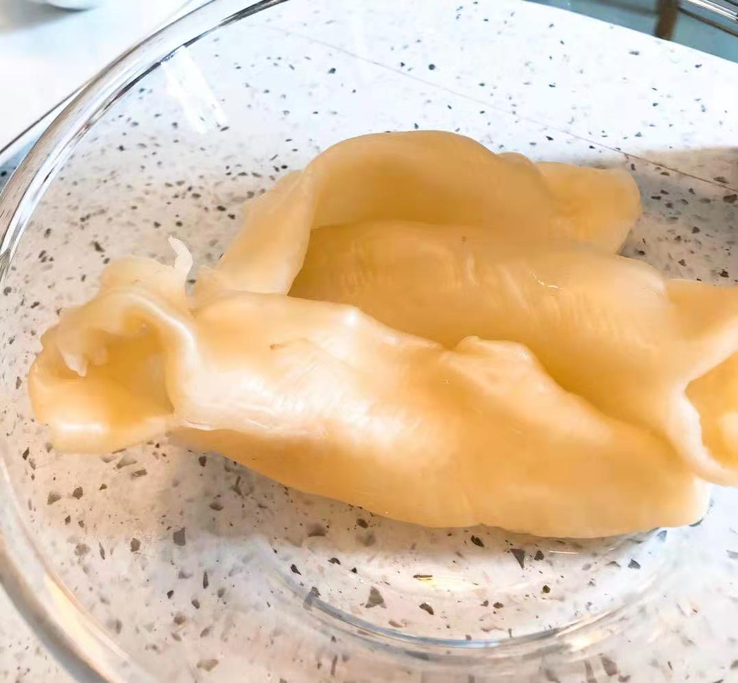 该鱼胶特性是干货鱼油比较少,浸泡后,爽口不腥不腻。