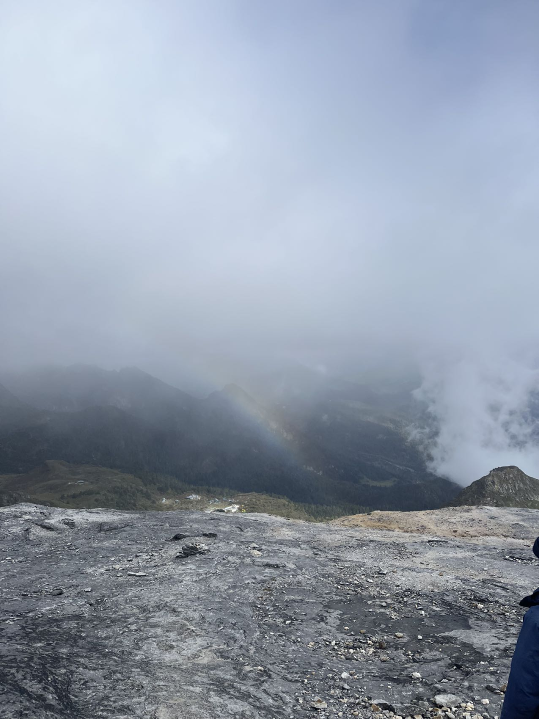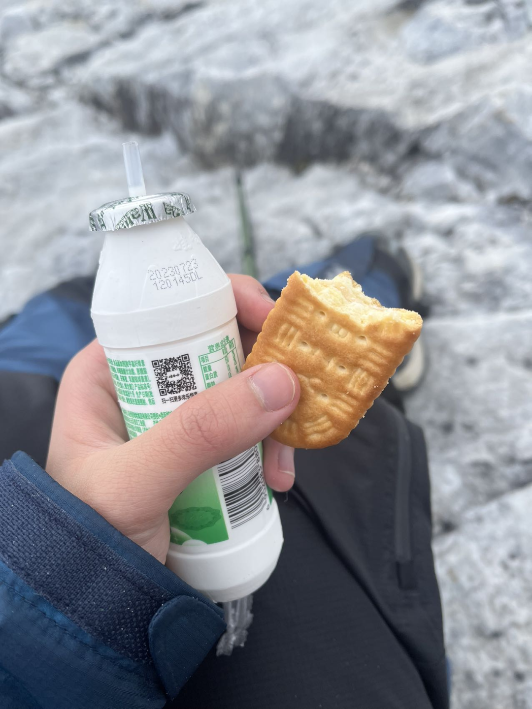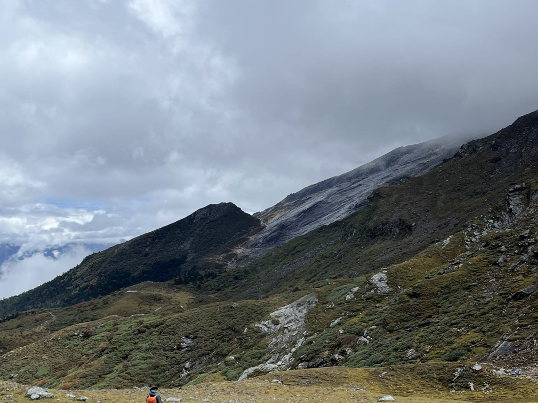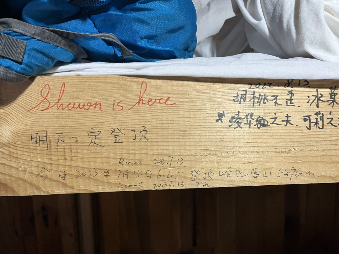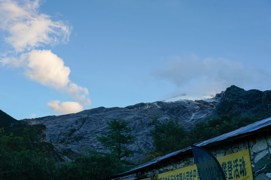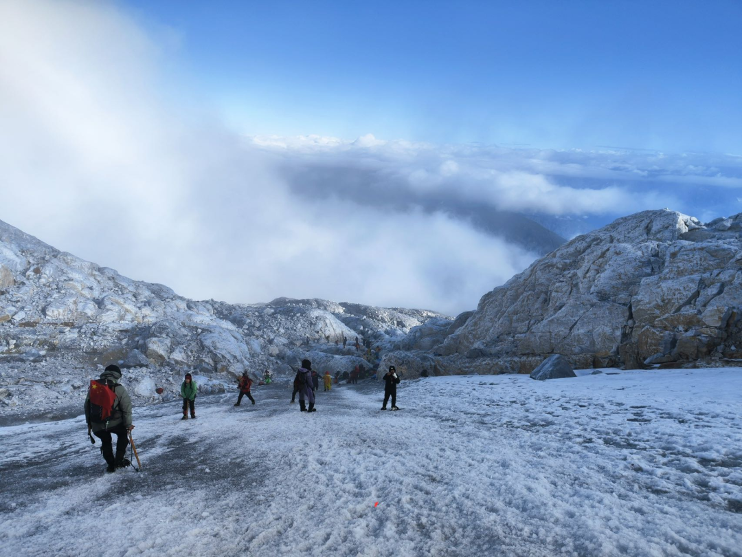 走到大本营,倒是觉得哈巴又没那么吓人了。大石板看起来缓了很多,就是一个长长的大缓坡,透过云雾可以隐约看到雪线之上的月亮湾,甚至是顶峰,感觉好像也不是很难,甚至口出狂言:“区区小山,明天一定拿下” (就因为这句话,第二天爬山时我真的完全没想过下撤,不然多丢脸啊)