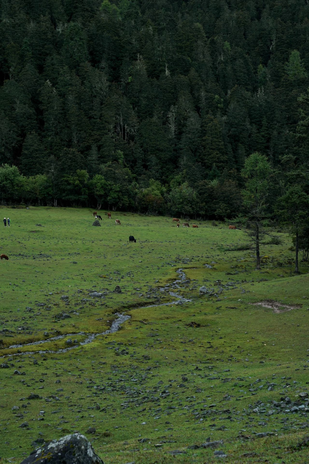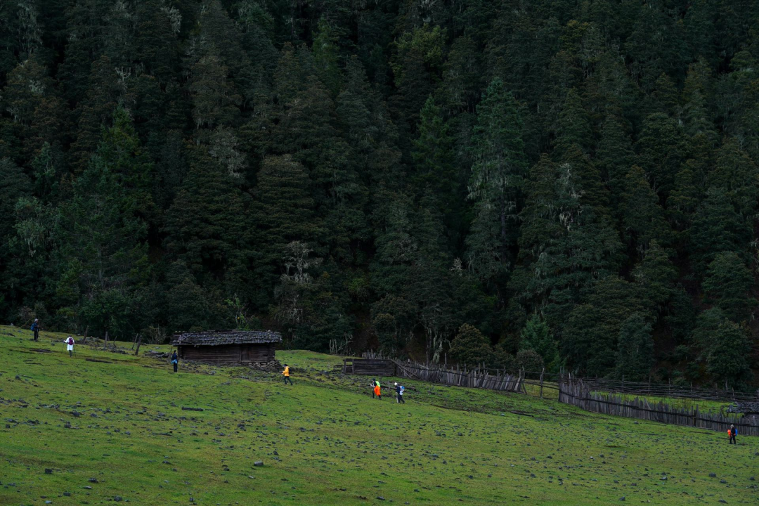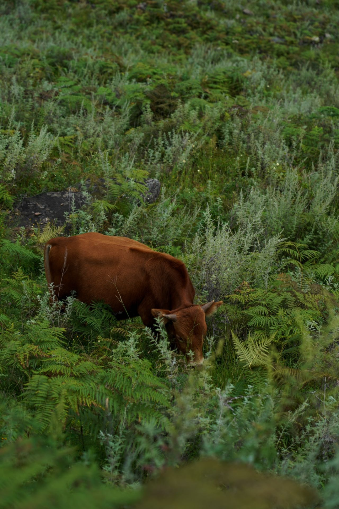 下午的路途就非常轻松了。在哈巴雪山山腰上横切,累计爬升不超过10米,这才是一条入门线路该有的“难度“嘛。大概也只有这种轻松愉快的状态才会有心情看草坡中吃草的老牛。