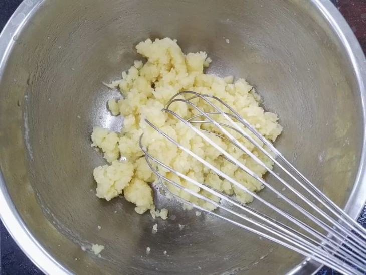 黄油提前室温软化至能用手轻松按出小坑,加入糖粉用刮刀拌匀,搅拌均匀,至黄油微发,颜色变浅;