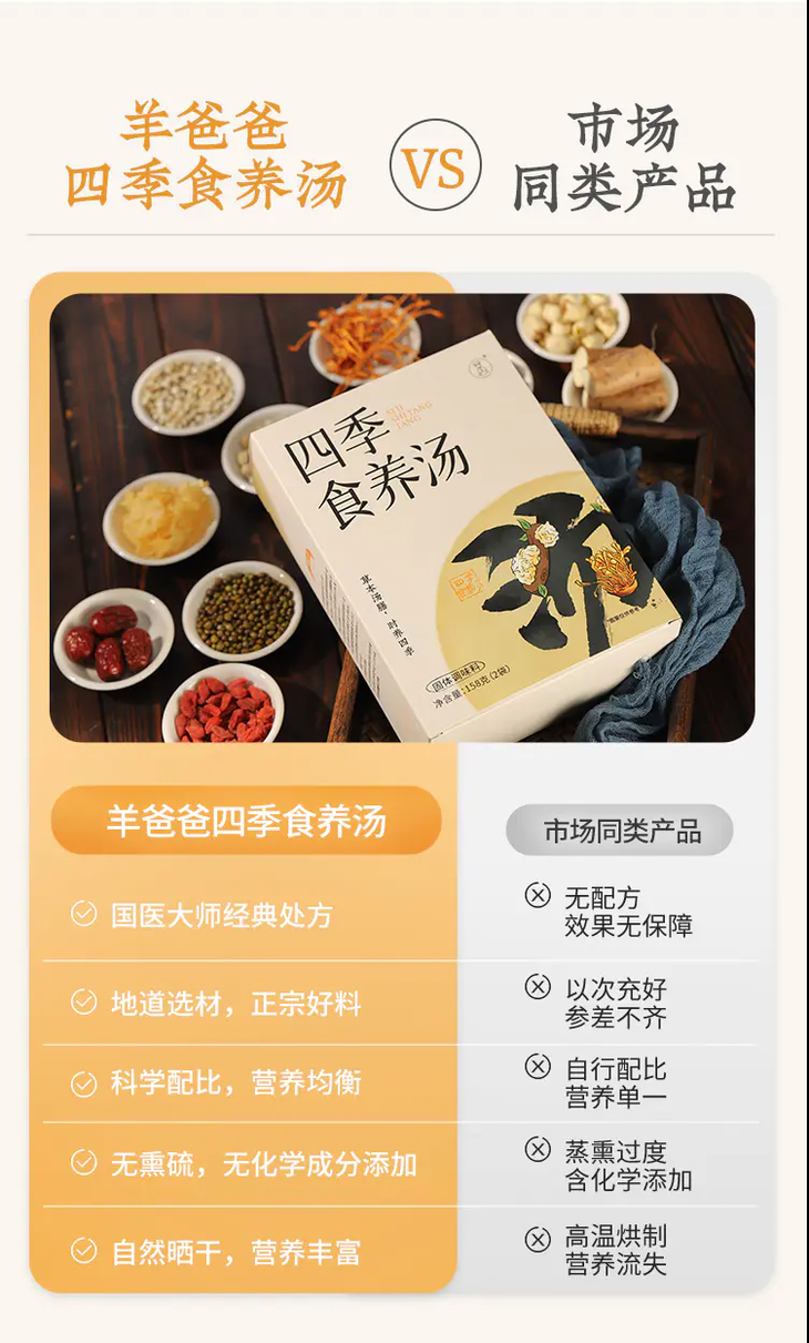 羊爸爸四季食养汤,它是经过国医大师朱春良处方加减而来,以蛹虫草、白扁豆、山药、枸杞等药食同源食材,科学定量搭配,膳食营养均衡,适合全家老少、四季皆宜。