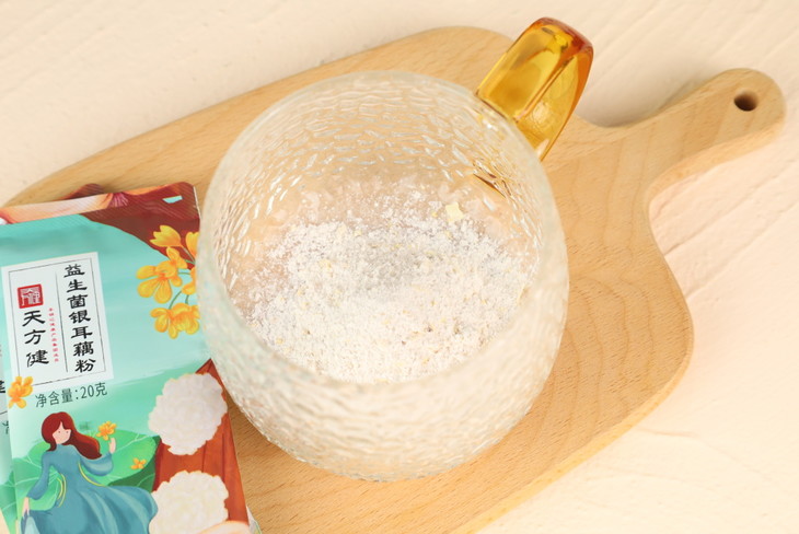 1. 撕开一小袋(20克)益生菌银耳藕粉,倒入容器中;