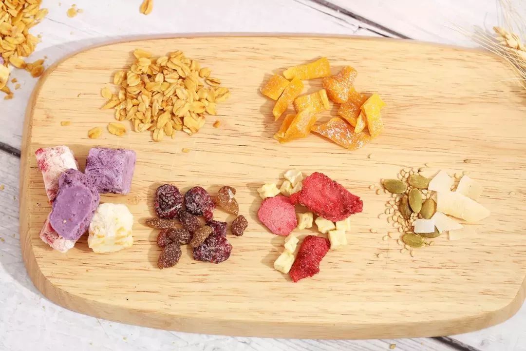 里面有6种果干,草莓是冻干,脆脆的;其中芒果干、苹果粒、蔓越莓干、葡萄干、椰子片都是用新鲜水果,脱水烘干做成的,吃起来很有嚼劲。