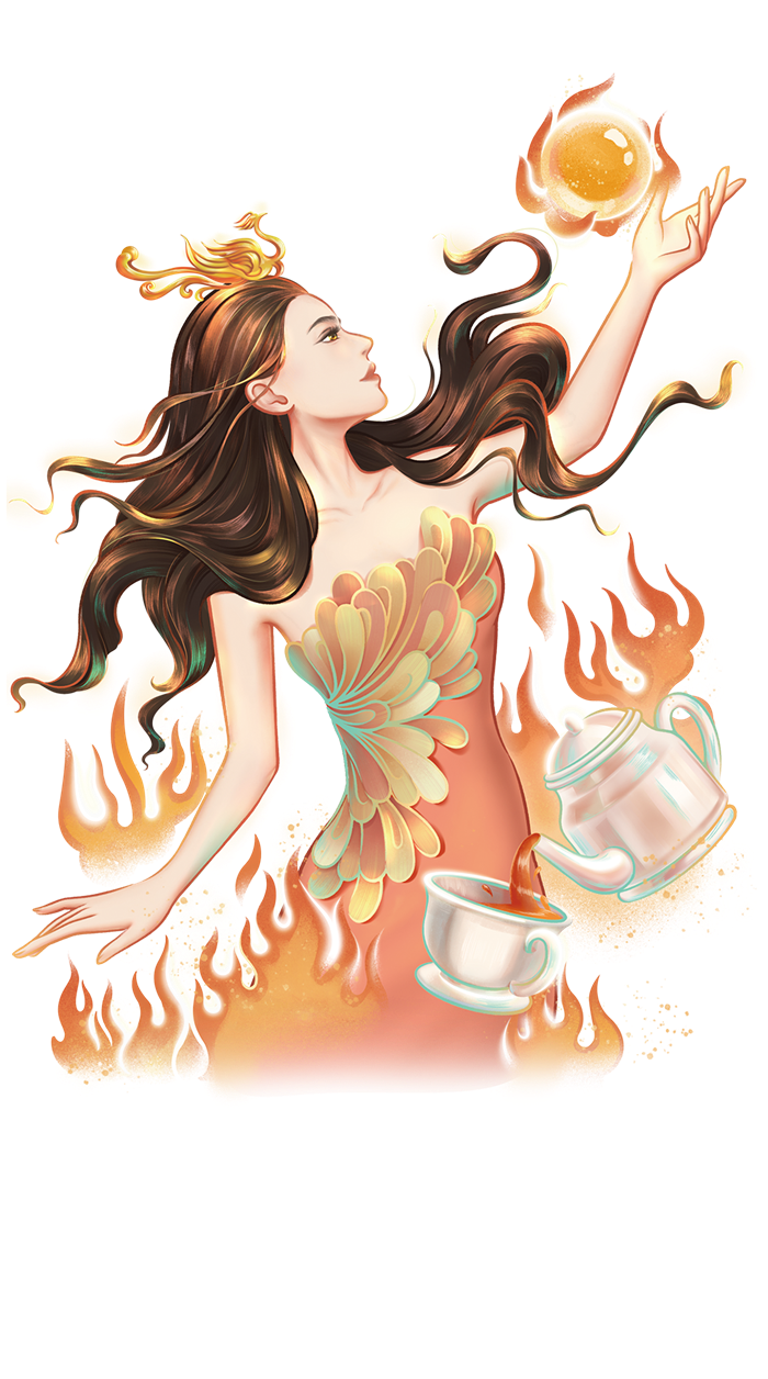鲜明的国潮风元素、东方神韵十足的凤凰女神(自在女神),运持着与心同相辉映、旷照通明的火焰宝珠(自在宝珠)。