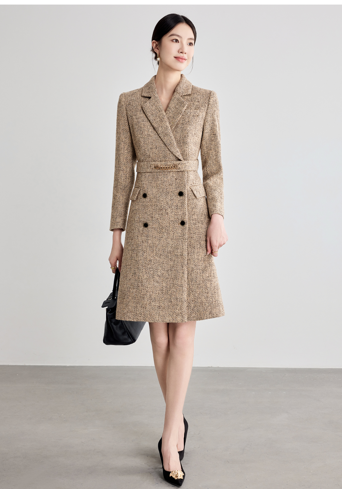 在都市的喧嚣中,这款粗花呢风衣连衣裙是职场女性的优雅铠甲。经典的西装领设计,利落又显气场,瞬间勾勒出干练的职场形象。