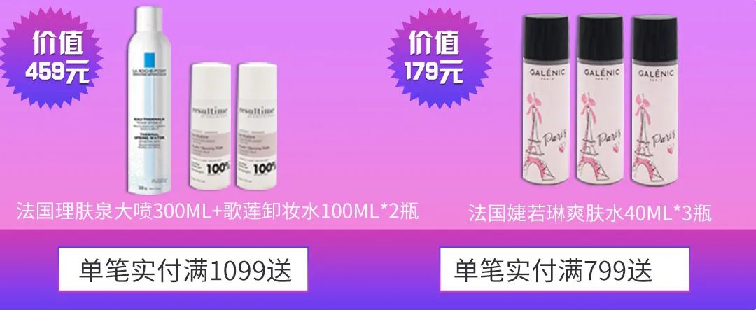 单笔实付满1099即可获赠价值459元的理肤泉大喷一瓶和两瓶法国Resultime卸妆水~(不得不说这也太狠了!说是白菜价一点也不为过!)