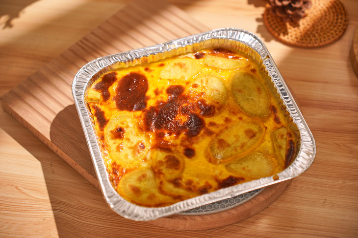 4、将红薯和蛋液按照一层红薯、一层蛋液的顺序重复放满锡纸碗