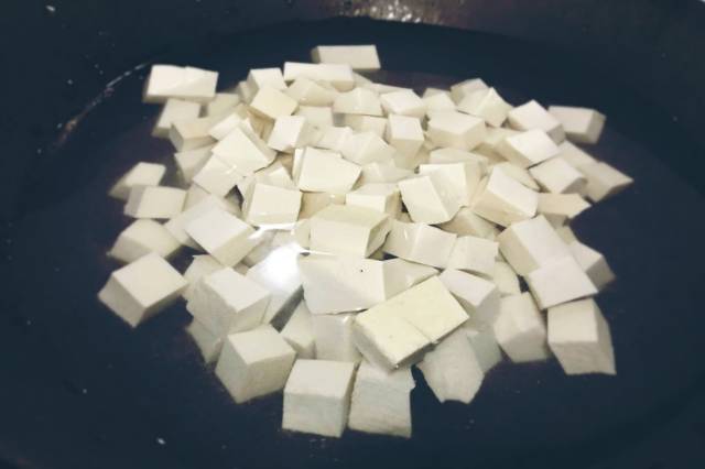 豆腐焯水后,豆腥味减少,吸收充足水分,加盐是为了让豆腐块不容易破损;