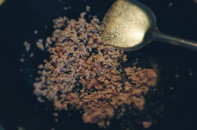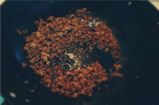 1、锅中倒入底油,油热后关火,放入肉末翻炒,不粘锅后开火,加入姜末炒出香味;