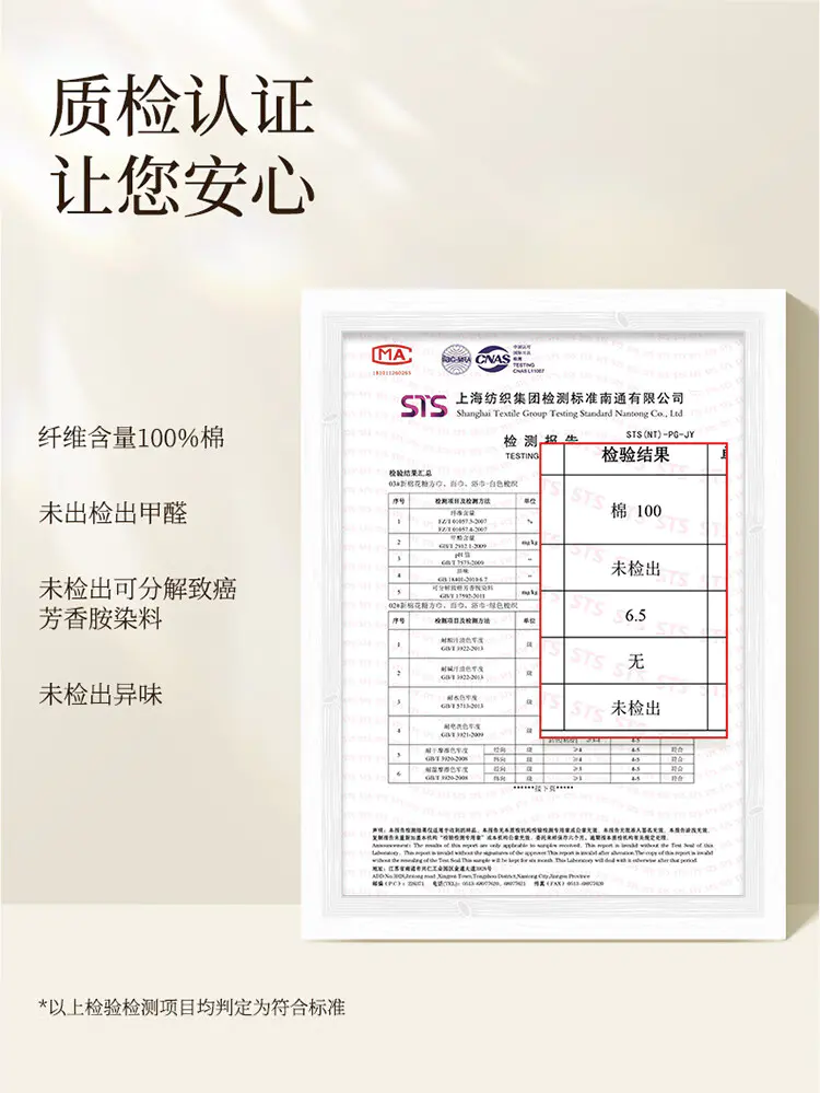 检测认证:通过上海纺织集团检测,纤维含量、安全性等全项目达标。