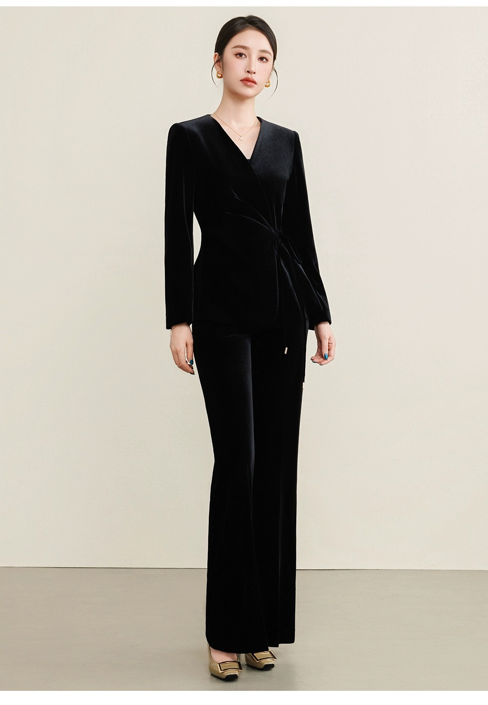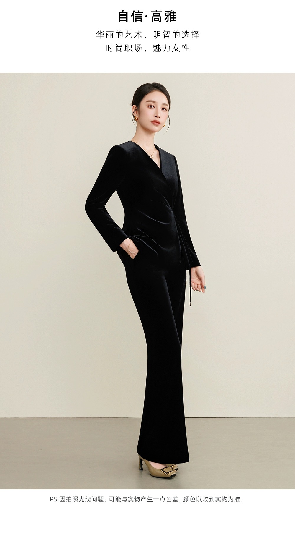 在秋冬的穿搭赛道上,这套黑色丝绒V领西装套裤,是“质感”与“时尚”的双向奔赴。它不止是一套衣服,更是你职场形象的“加分项”——让你在严谨的职业语境里,也能尽情释放时尚品味,成为别人眼中“穿得高级又有态度”的存在。