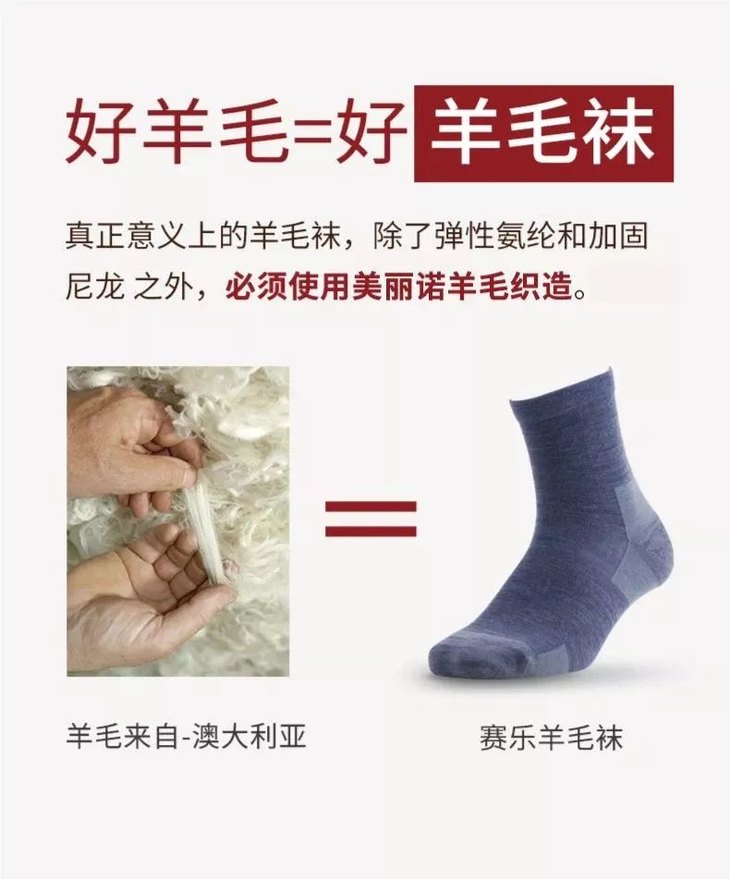 赛乐羊毛袜使用的是澳洲进口的美利奴羊毛。在地球上已知的纤维中,美利奴羊毛(Merino)具有独特的温湿度调节功能,是性能最优越的功能纤维之一。