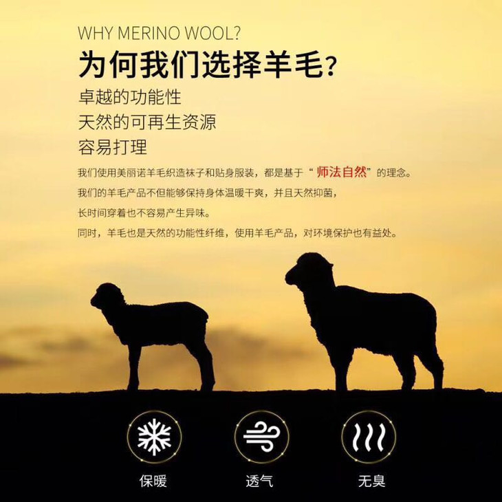 不仅如此,美利奴羊毛还是天然的功能性纤维,不仅吸湿除臭,还能调节气温(天气冷,TA能提供热量;天气热,TA能让皮肤冷却),所以,美利奴羊毛还被称为最聪明的羊毛!