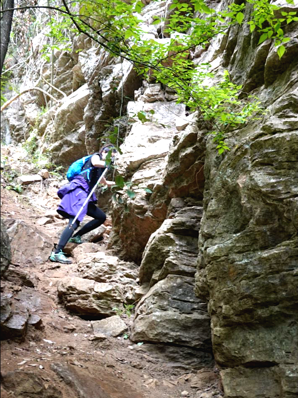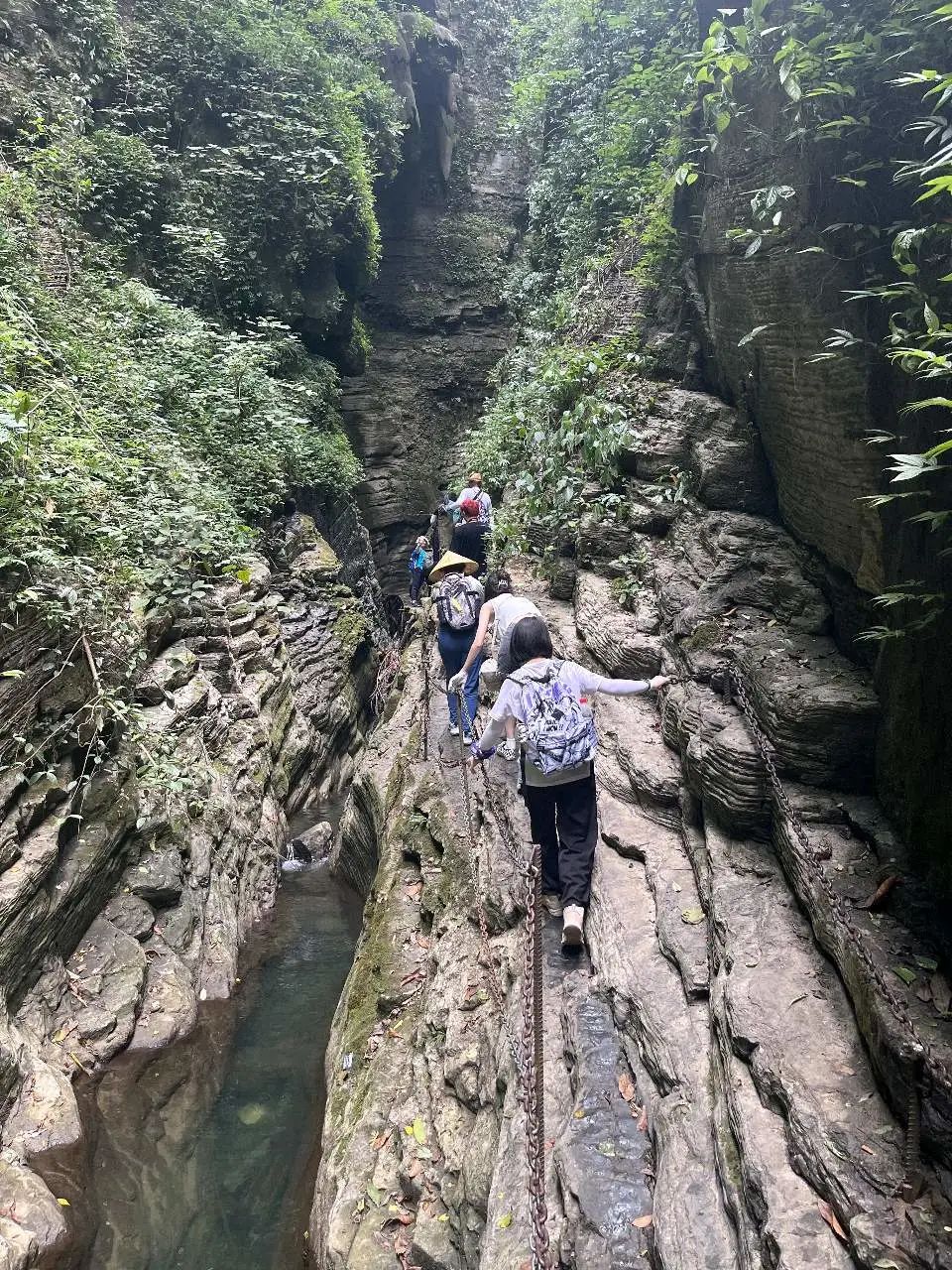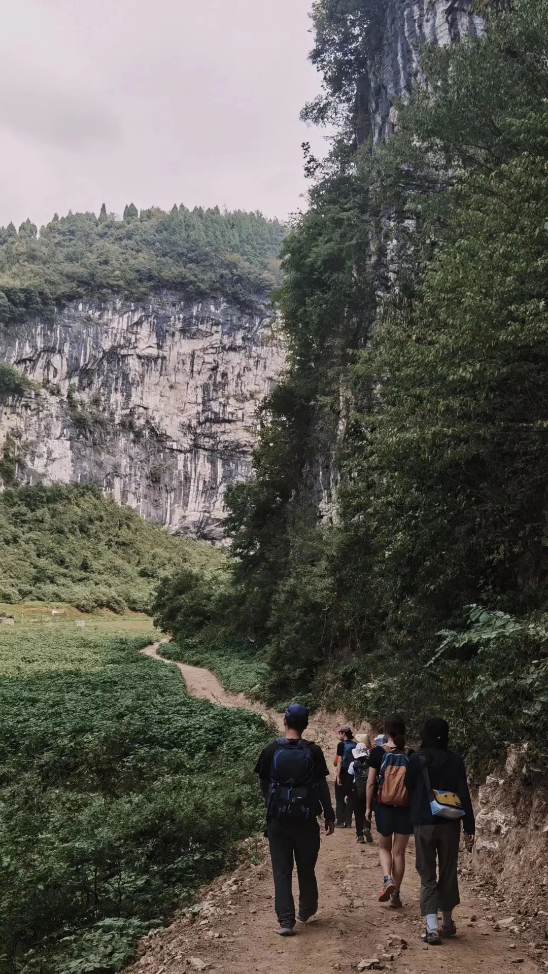 走出洞穴后一行人沿着山壁徒步,挺震撼的,一边是山壁,一边是低处见不到底的山林,抬头看甚至也不知道接下来要从哪个地方走出去。
