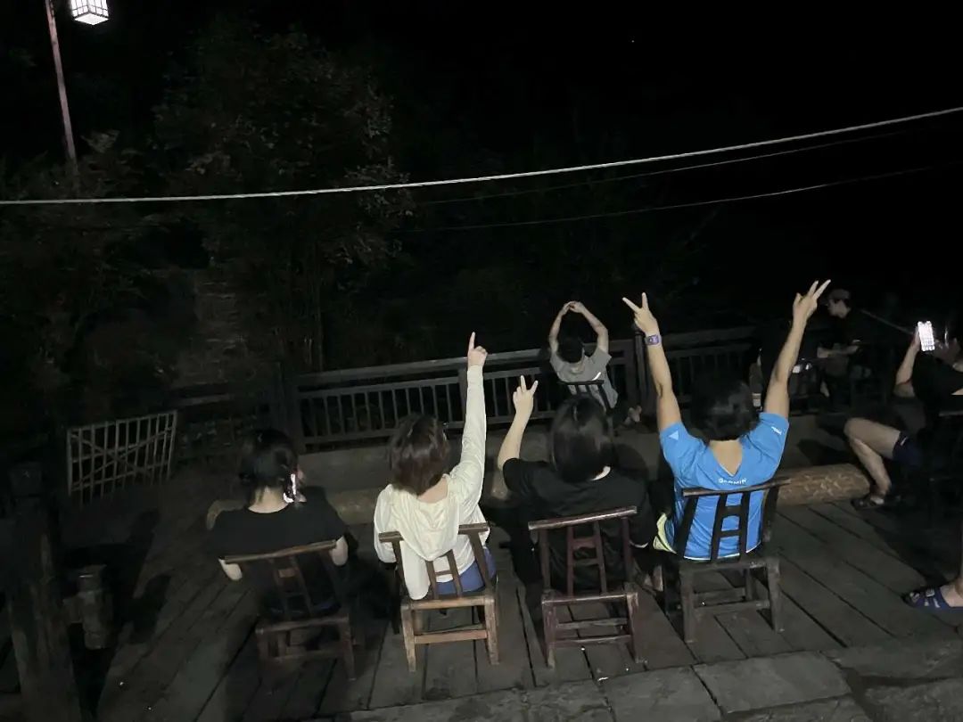 敞开的大厅外有一个小露台,大伙儿吃完了饭搬了个小板凳坐着看星星。从下往上看,黑幕上亮点清晰可见,历历可数;从上往下看,黑夜包裹着四四方方的小客栈,中间露台开了一栈暗暗的灯,里头坐了几个看星星的人。