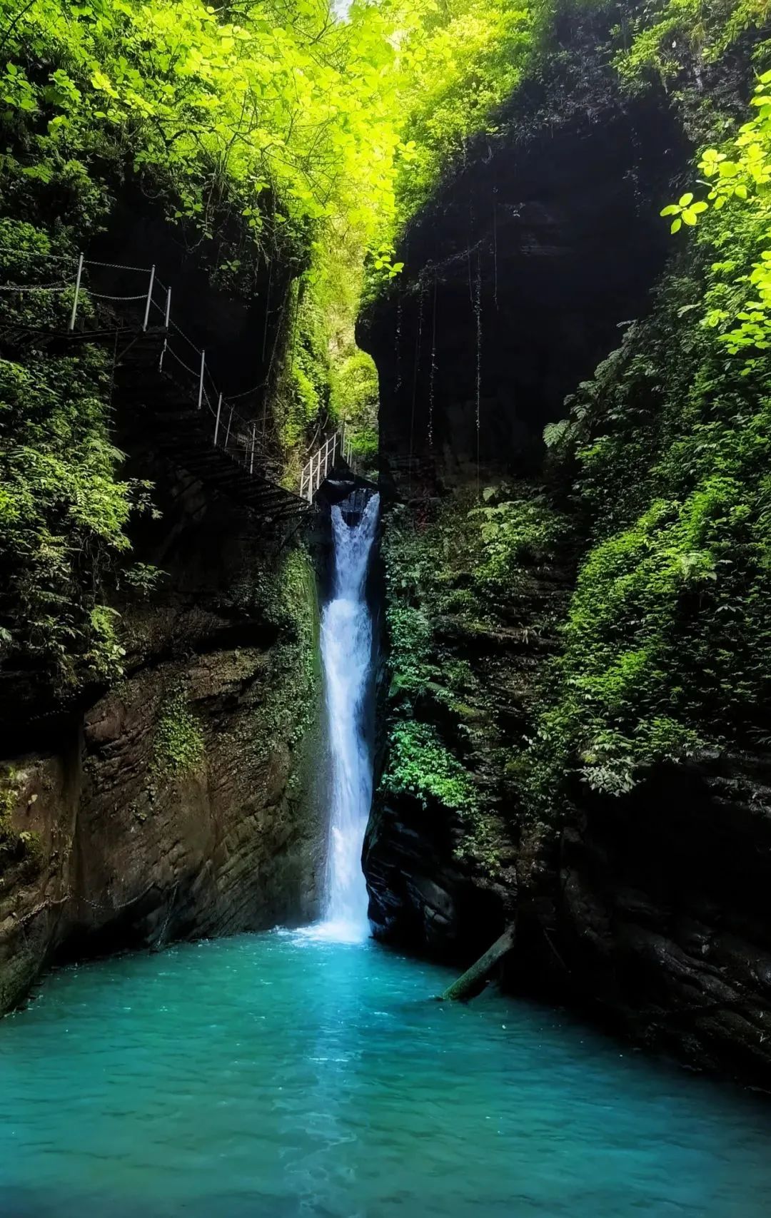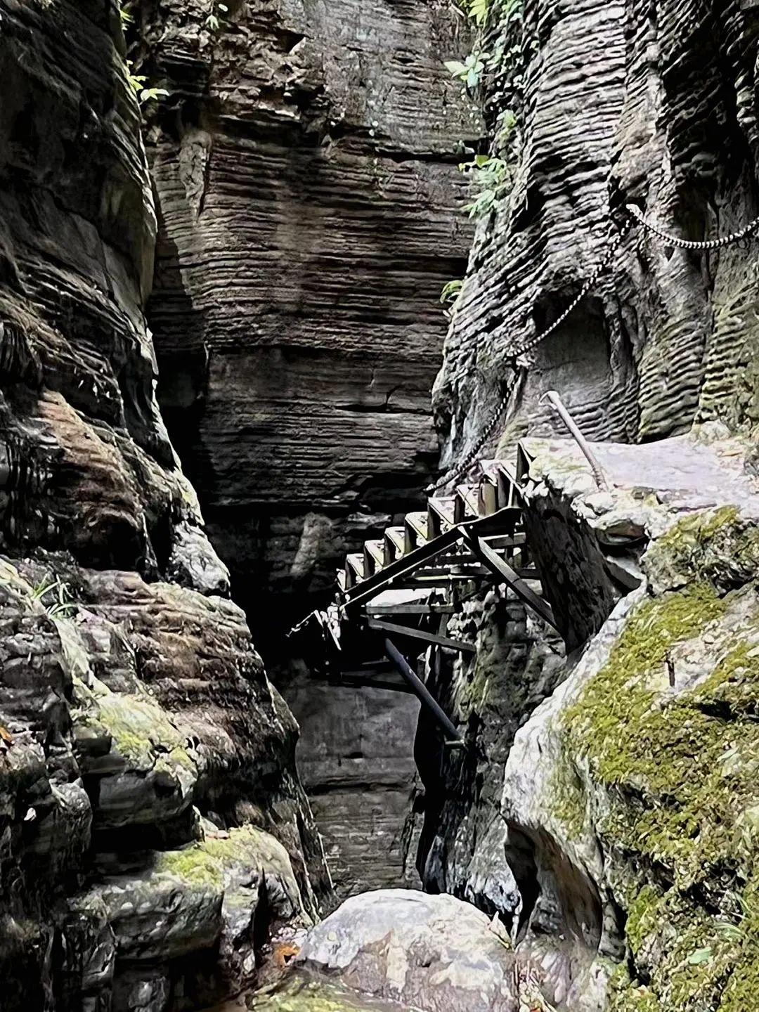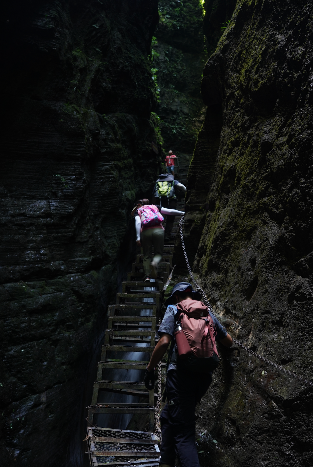 坐龙峡不算小众,虽然路线险峻,但实在有趣,故前来游玩的游客基数也不小,期间遇到游玩的一家四口,妈妈带着一个大约七岁的女儿,爸爸抱着一个两三岁的儿子,仔细一看那个小孩没有任何固定措施,只是抱着,在一个几乎垂直的爬梯上,那个爸爸只是叫他的儿子抱紧,便双手开始攀爬,惊呆了。
