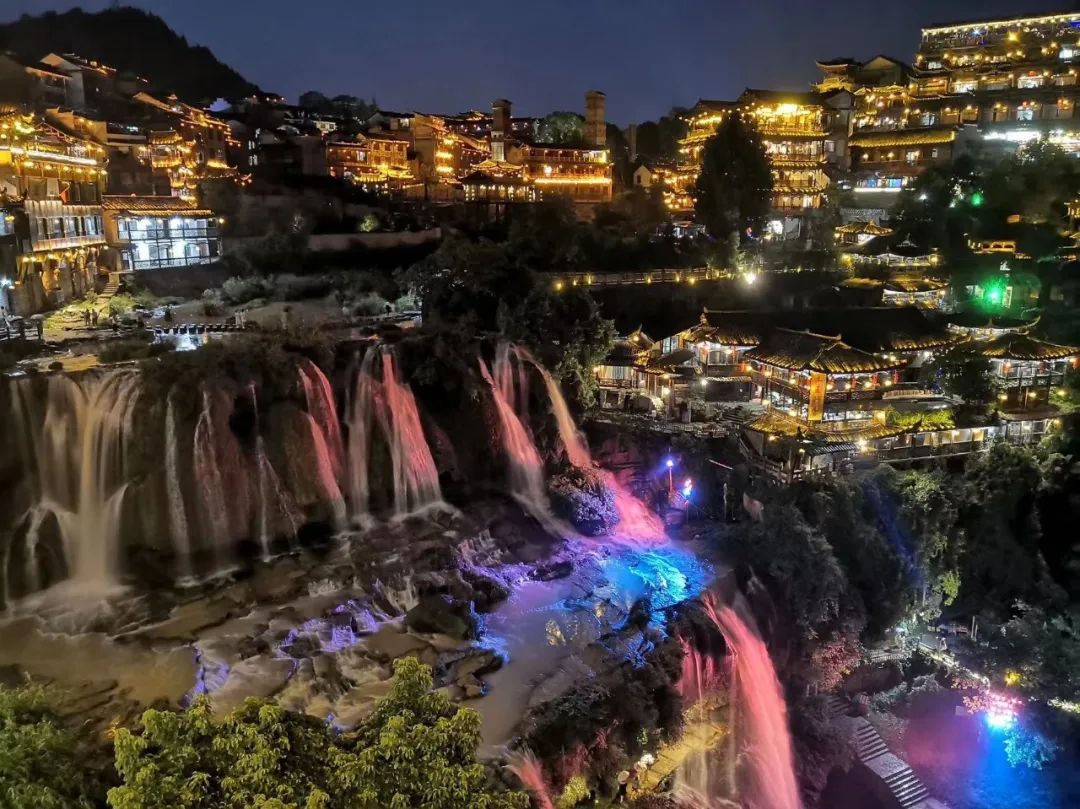 逛过一遍后是八点,景区的歌舞剧表演也开始了,我站在人群中,只听突然后面传来一声巨响,一排方阵由上至下开始表演,绿色的烟和白色的光喷出,场面被烘托得向一场不真实的法事,又是一声响,一个带火的箭矢自后往前穿过观众的头顶打到了舞台上的堡垒,接着便是男男女女以舞蹈形式跳出了芙蓉镇的历史。