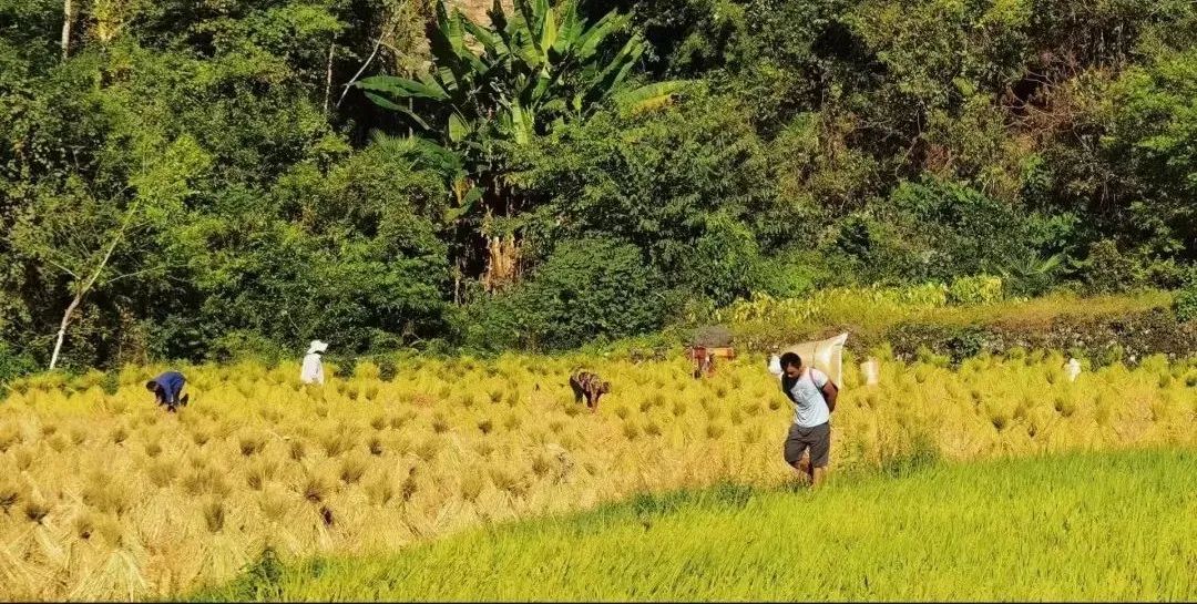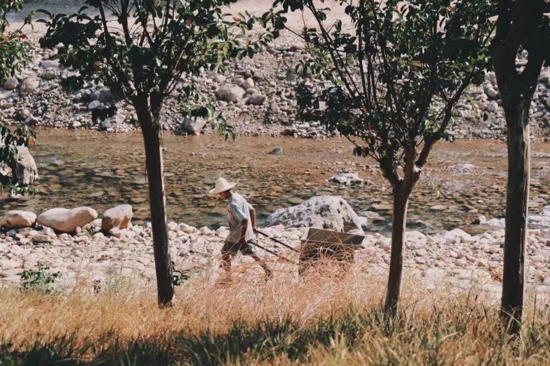 第二天一早,大家收拾了东西开始往山下走,我才发觉狃花客栈仅是坐落在半山腰而已,向下走时路过了一个小聚落,田中有几人耕作,不知八月底是在耕作什么农物,这一路走来,路边可见的玉米都枯死在了田里,今年的气温异常高,向来耐旱耐热的玉米也没抗住。