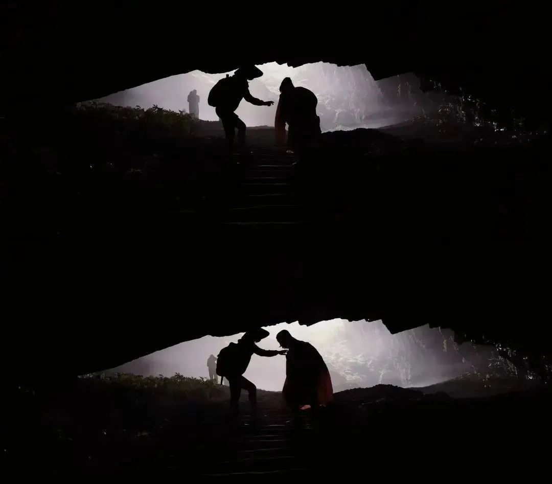 在洞口的时候已经能看见外头的光亮,大家一个一个爬出去之后是一个很高很高的我无法想象如何形成的地形,洞口外还是一个洞,但烟雾缭绕,由于阳光照进来的缘故还会给人豁然开朗的感觉,水汽在光的照射下像是一束一束抬头可触的水线。