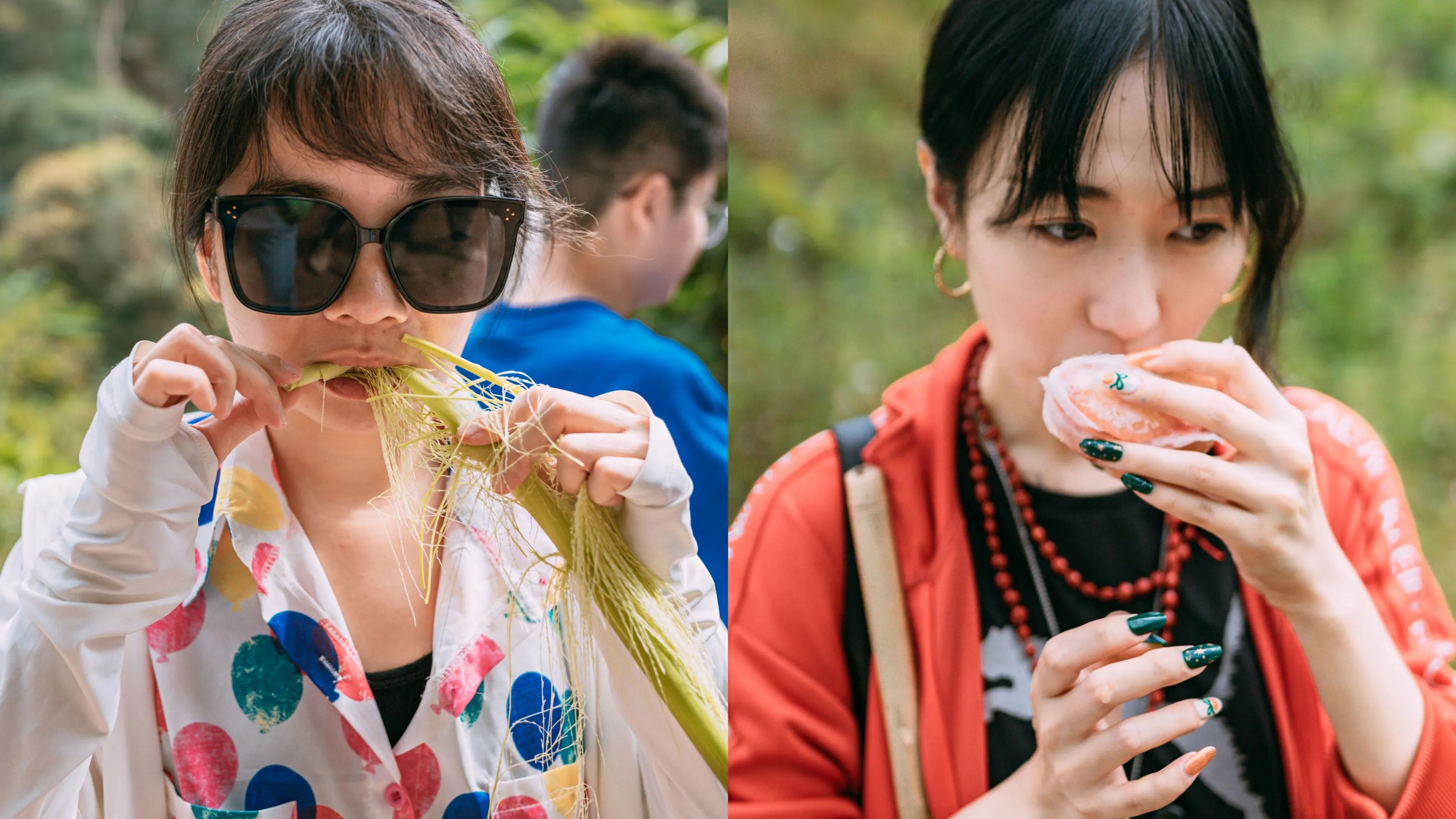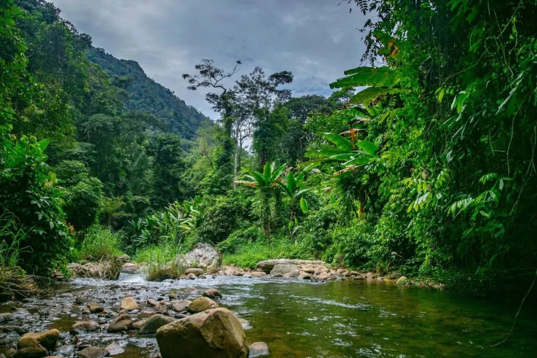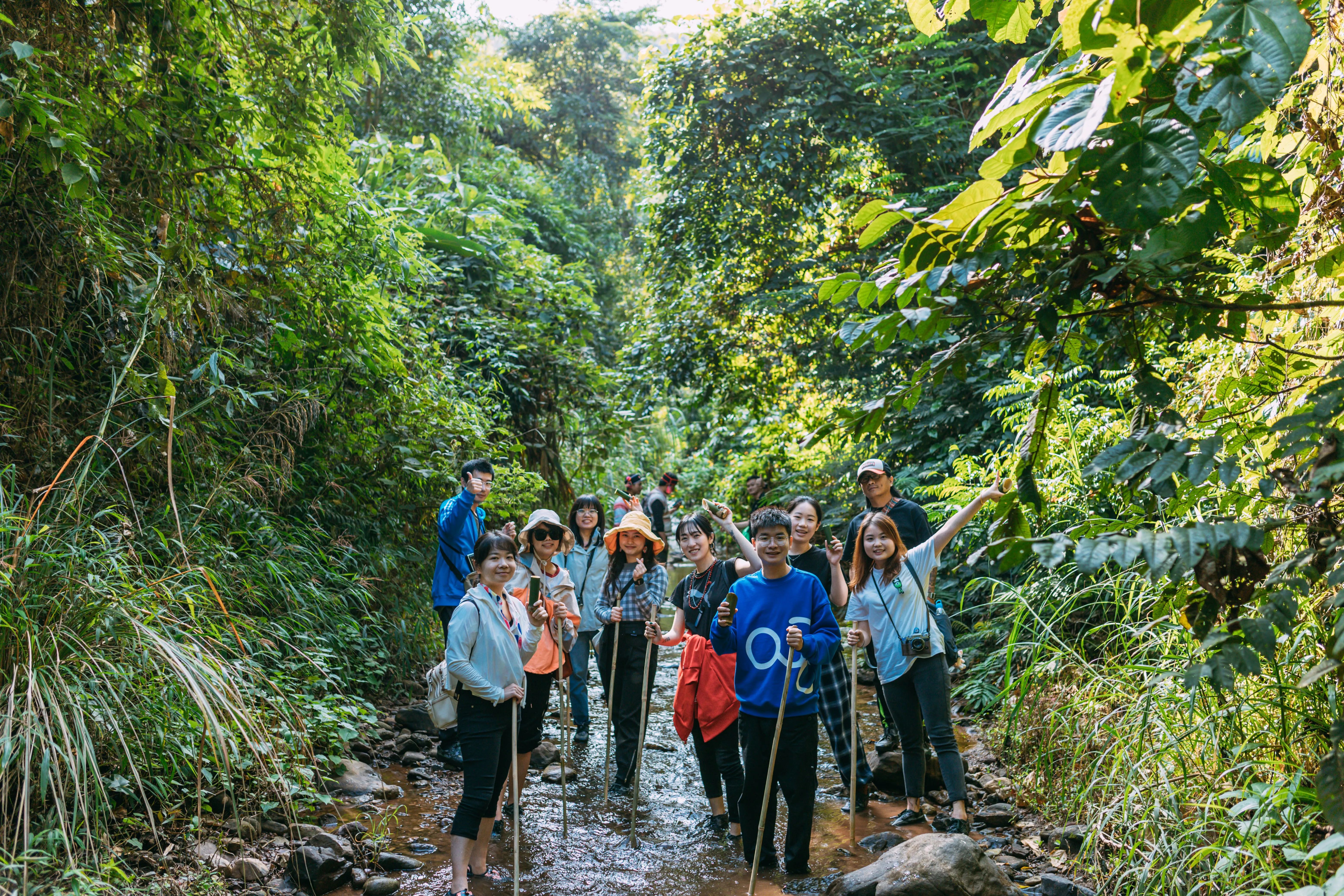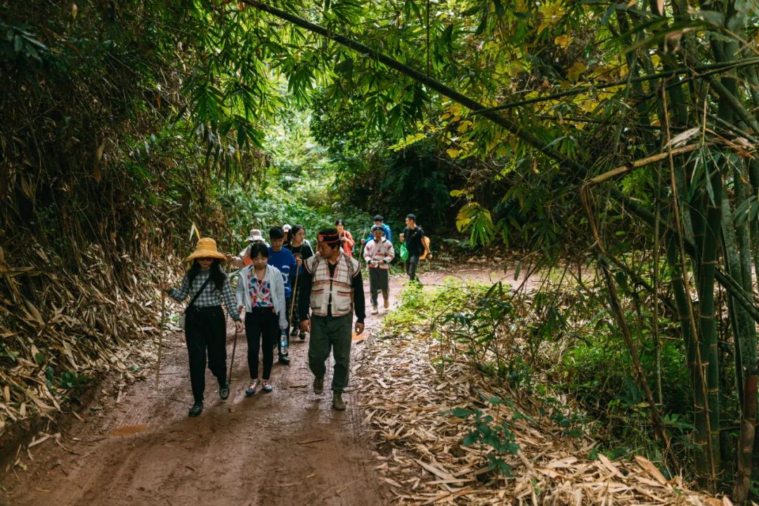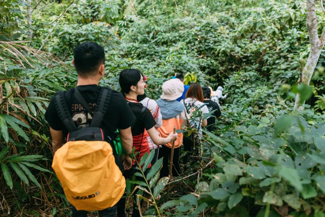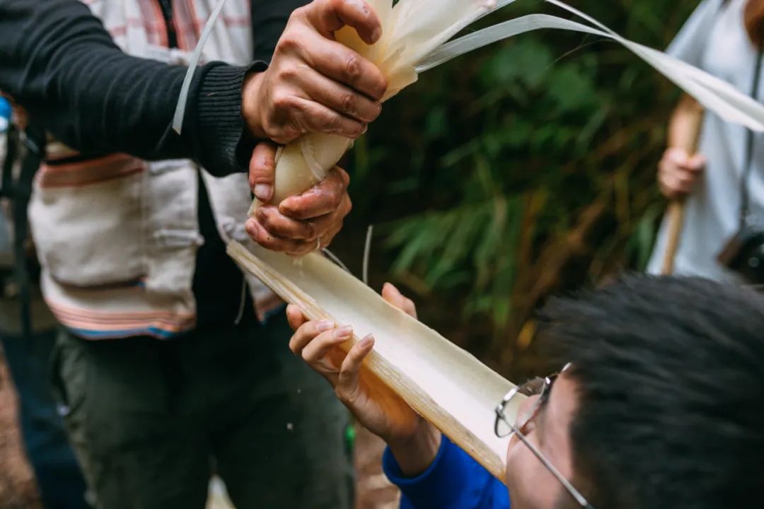 为什么要再逛一次植物园?因为这里不只是一个绝佳的取景地,更是中国面积最大、收集物种最丰富、植物专类园区最多的植物园,是集科学研究、物种保存和科普教育为一体的综合性研究机构!跳舞草真的会跳舞,舞女兰真的很像穿着裙子翩翩起舞的女子,路边捡到的蛋黄果,吃起来也真的很像蛋黄......夏季的王莲,能够承载一个成年人的重量。在这个上午,我们仿佛又变成了小孩子,在心里由衷地说了一句:大自然可真是神奇。从小时候看的书里、动画片里,我们获取了对热带雨林的第一印象:蛮荒、神奇、神秘中隐藏着危险。而西双版纳拥有中国唯一的热带雨林自然保护区,这次来,“走近雨林”已经无法满足我们的好奇心了,必须要“走进”去才行。深入雨林,需要好的向导。我们的向导是两位世代生活于此的当地的基诺族老乡。这是向导俊哥,正在为大使们制作竹杯。徒步之路第一部分,是丛林间的小路,俊哥一路给我们讲解看到的植物,我们眼里平平无奇的植物,在基诺族老乡眼里各有各的用处。 扫把花不仅可以做扫把,把它的茎剥开,里面的芯还可以吃......看到路边有野柚子,俊哥三两下就爬上了树给我们摘柚子,而我们像嗷嗷待哺的小朋友一样,围在树下,等着新鲜的柚子从天而降。一路吃着野柚子和各种新鲜玩意儿,渐渐走进了雨林深处。繁茂的灌木生长过快,已经挡住了崎岖的小路,俊哥和他的助手一路用腰刀为我们开路。我忍不住想,第一个走进亚马逊雨林的探险家,应该也是这样为自己开路的。在山地密林中艰难地跋涉,一个下坡过后,一条清澈可爱的溪流出现在面前。接下来我们就要溯溪而行,向雨林野炊的营地进发~