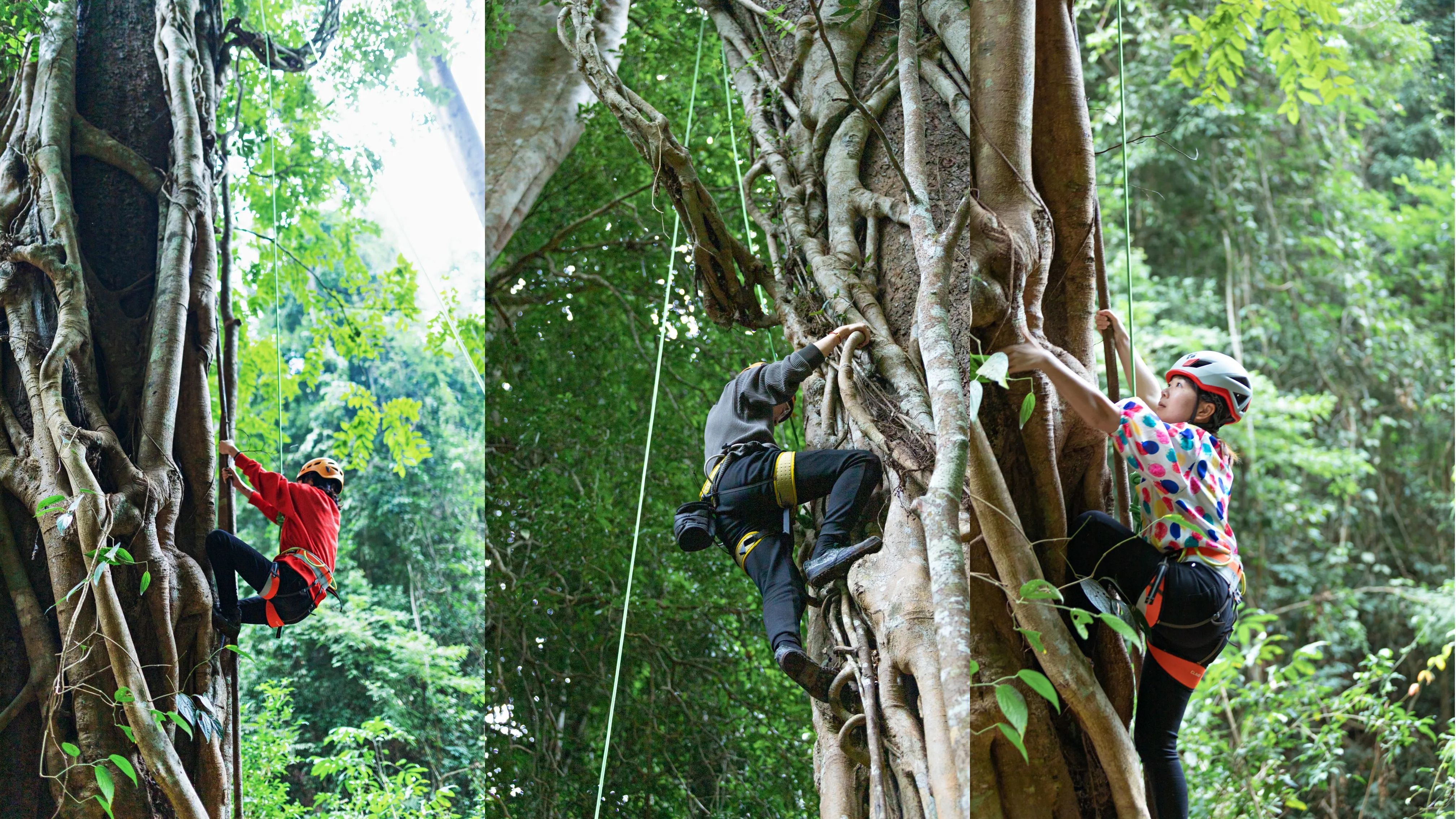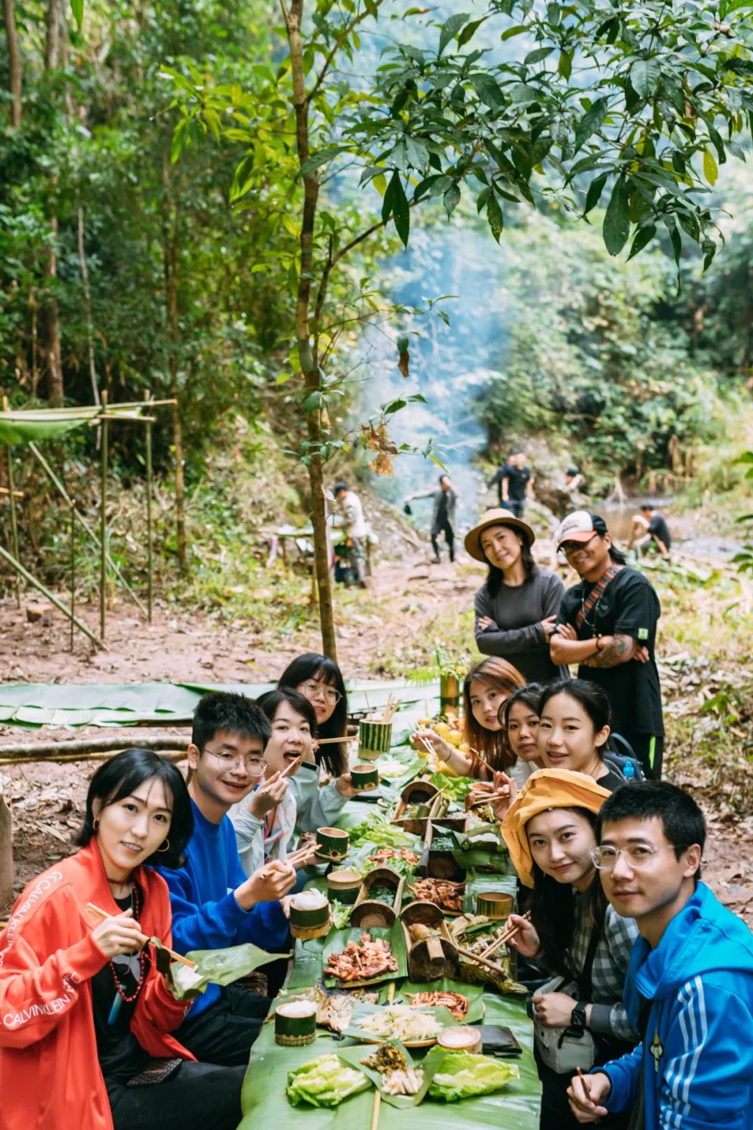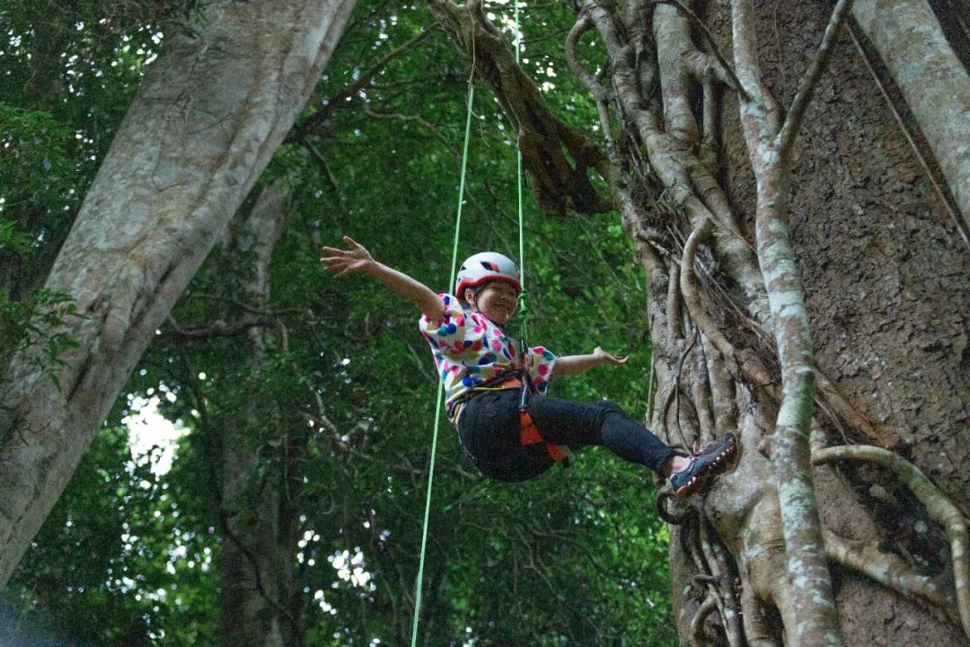 即使在冬天,溪水也不算刺骨,我们走走停停,脚踩在清溪的沙石上,感受溪流温柔的冲刷,你会感觉自己和自然如此亲近,好像本该如此一样。中途俊哥还停下来伐倒一棵芭蕉,教我们“芭蕉心取水”的生存技能。芭蕉心里的水味道清新,带一丝甜,大使表示,“好像有点黄瓜味儿。”低头跋涉的同时,别忘了抬头看看风景。两岸连山,在溪流尽头汇聚,30多米的巨木本就高大异常,依托山势起伏,更显得高大得难以名状。举起相机想要记录下来,却发现相机即使勉强把树木顶端拍进画面,也无法表现那种冲击感。算了,相机拍不出的东西,眼睛却可以看到,心灵却能够感受。我的文字表达不出的东西,就交给大家的想象吧。因为在路上玩了太久,我们到达营地的时候。老乡已经准备好了大部分饭菜。但我们还是动手参与制作了“包烧鱼”和“包烧杂菌”。这顿饭是真·纯天然出品,连杯子、碗饭都是用竹子现做的。芭蕉叶包着食材在炊火上烤制,散发出烤肉香和植物的清香。吃完饭活动活动筋骨吧!别人饭后散步,我们饭后爬树。这棵30多米的绞杀榕可以挑战一下👇这样的高度令人望而生畏,但其实只要找对落脚点,一步一步向上爬,再回头的时候,你会发现自己已经走了很远。攀爬成功后,在专业教练的帮助下速降落地,有些胆小的朋友表情管理失败👇攀树之后,和老乡们挥手再见,踏上返程,虽然走得腿有点酸,但心里隐约觉得,如果能再来一次,我一定还会来的。