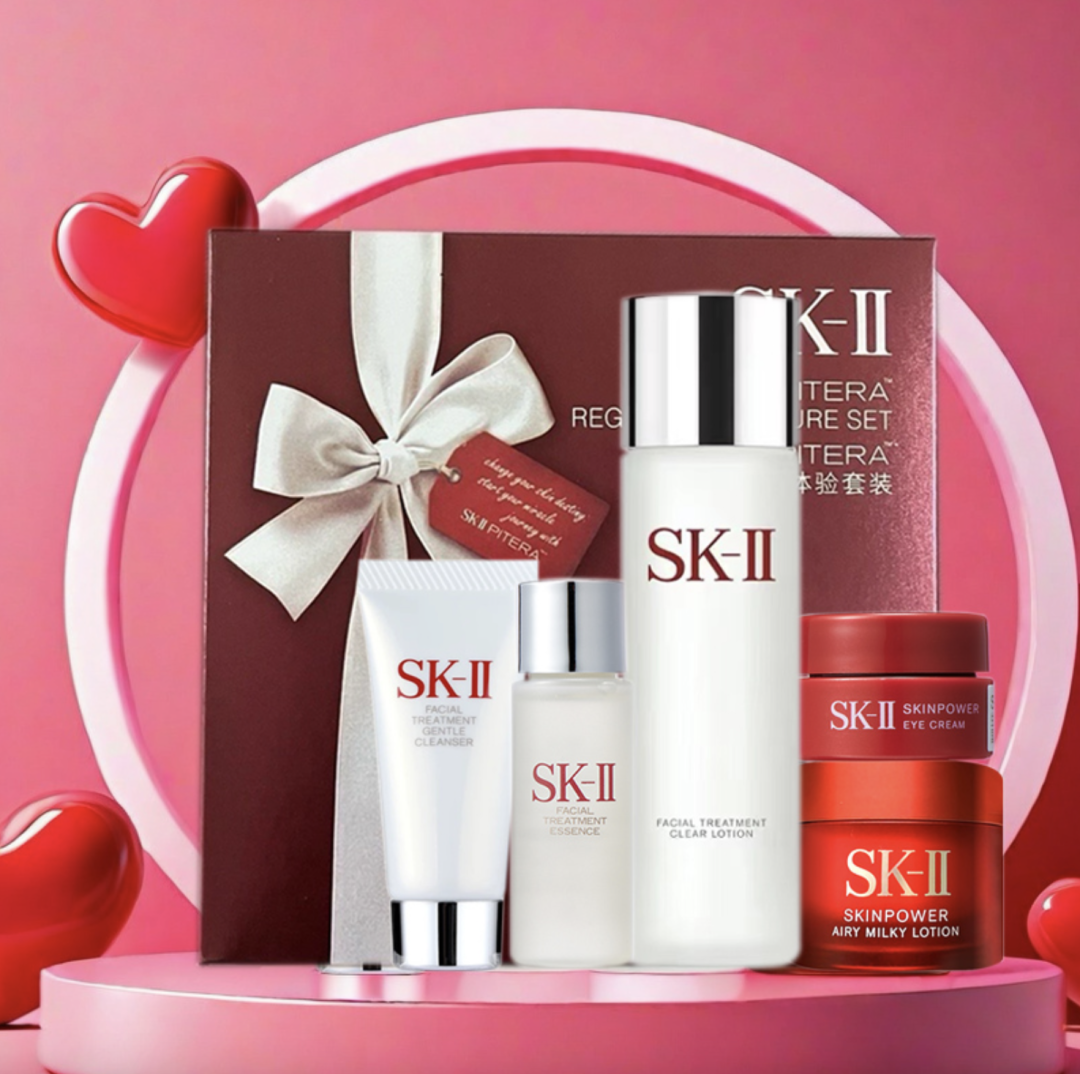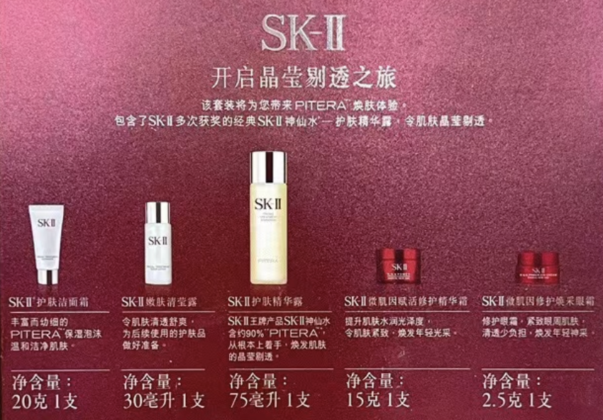 内含:神仙水75ml+清莹露30ml+洁面20g+大红瓶面霜15g+眼霜2.5g,5款都是sk2家的核心产品。