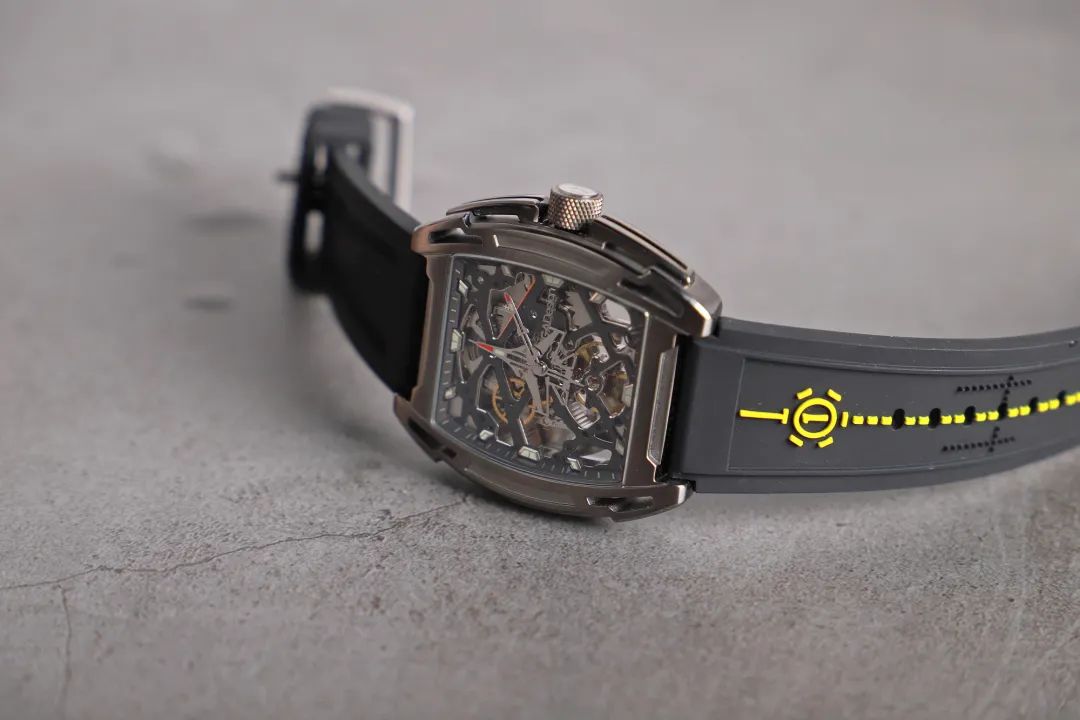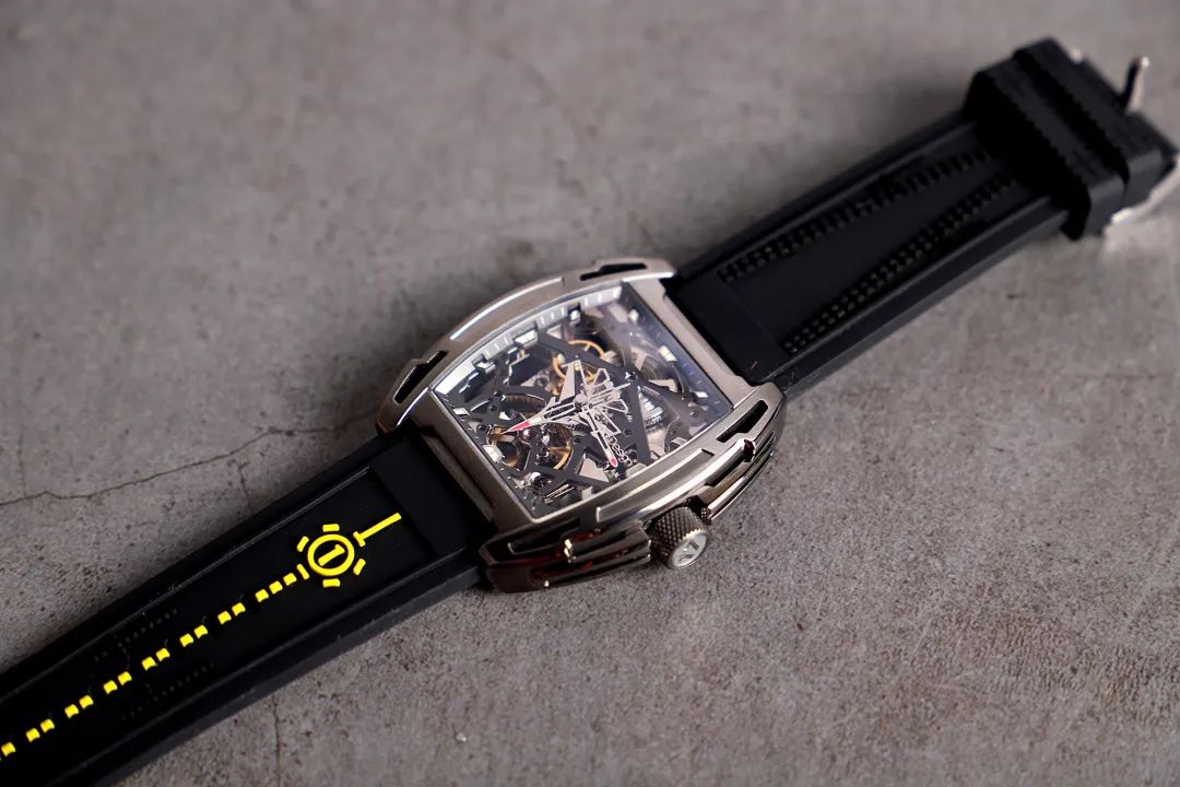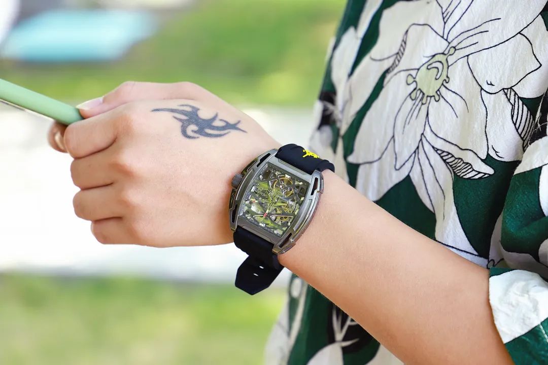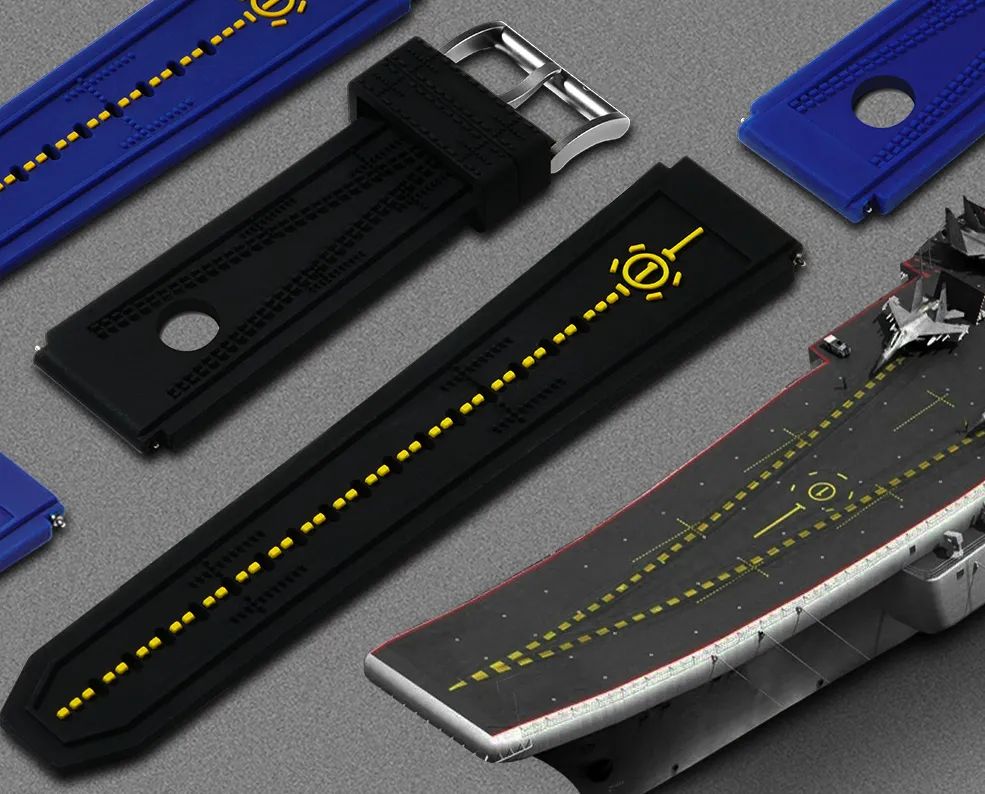 还以舰载机的飞行甲板为创作元素,将跑道与表带融为一体,加上食品级硅胶材质上手比皮带钢带更舒适。