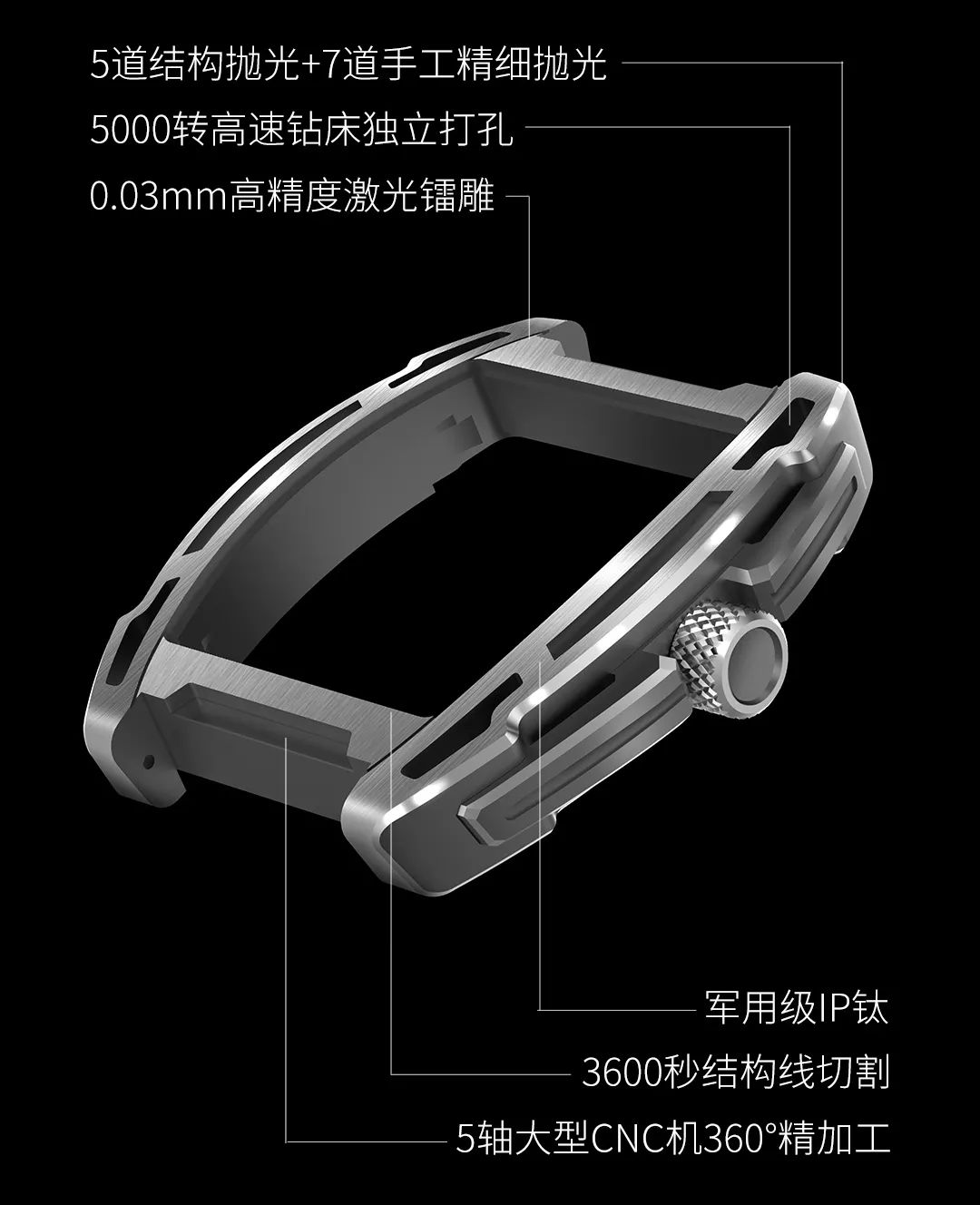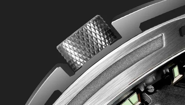 再来就是表壳的工艺,航母的环境对防腐蚀的要求非常严格,这款表中使用了IP钛镀层,再联合多道抛光、打孔、镭雕、切割和精加工,增强防腐蚀并提高耐磨度,不怕用久后饱含时间的摧残。