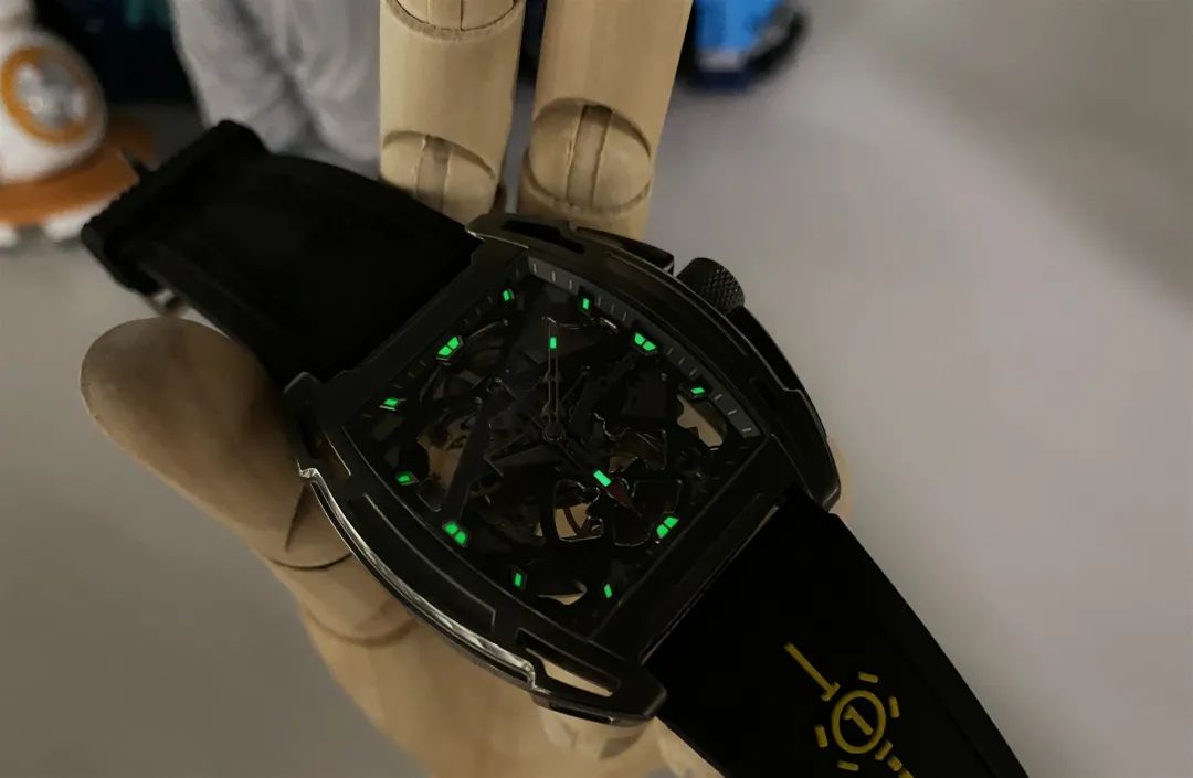 无需电池加持,到了晚上或暗一点的环境里,表盘表冠时针分钟就会自动发起夜光(比传统夜光亮10倍),戴上手简直能酷一脸。