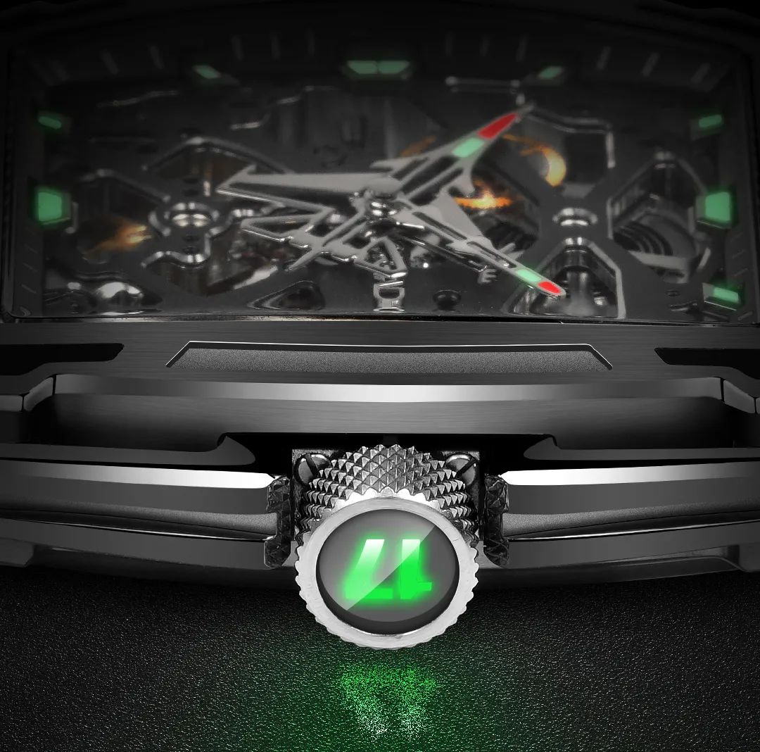 舰载机、舰载炮弹,决定了航母的战斗力,两者结合在表盘内,给佩戴者带来一种手握重权,在腕间蓄势待发的感觉。