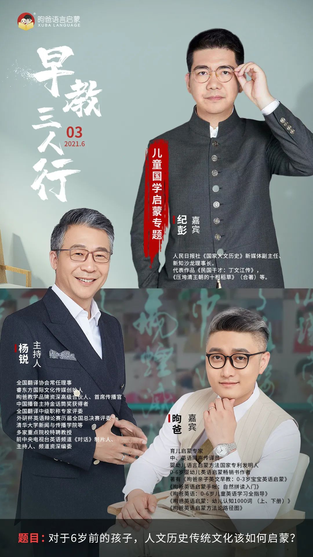 本期,《早教三人行》栏目特邀人民日报社《国家人文历史》新媒体副主任、新知沙龙理事长纪彭做客现场,三位老师就6岁前的孩子,人文历史传统文化如何启蒙进行了探讨与交流。针对家长们感兴趣的方面和一些困惑的问题,几位老师也给出了很好的建议与指引,希望可以帮助到大家。