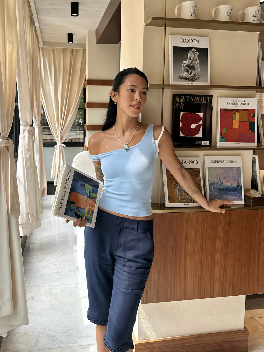 新品上身 |斜肩背心+搭7分裤清爽蓝演绎度假风🎄