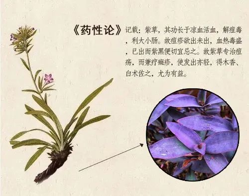 李时珍在《本草纲目》中记载紫草:“治斑疹痘毒,活血凉血,利大肠。”