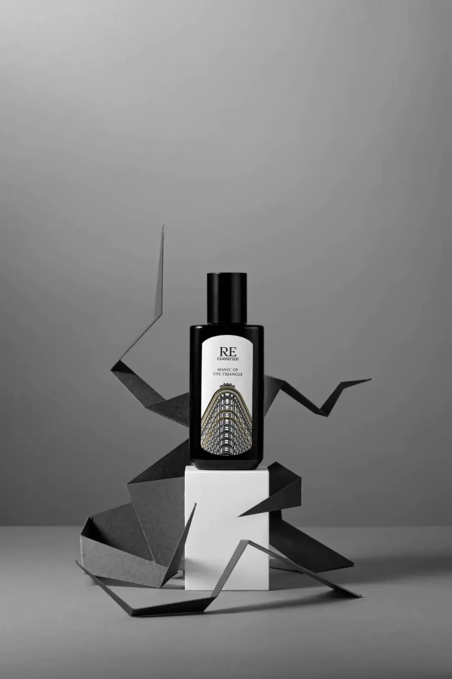 由青涩净雅的葡萄柚开头,再由广藿接棒,携同丁香呼啸于摩登都市的十字街头。这三种香原料的相互交织,彷佛毕达哥拉斯在黑板上速写着商高定理的狂慢笔触,绘制着熨斗大厦的三边耸立,是基石、是映衬,互不打扰,却相辅相成。