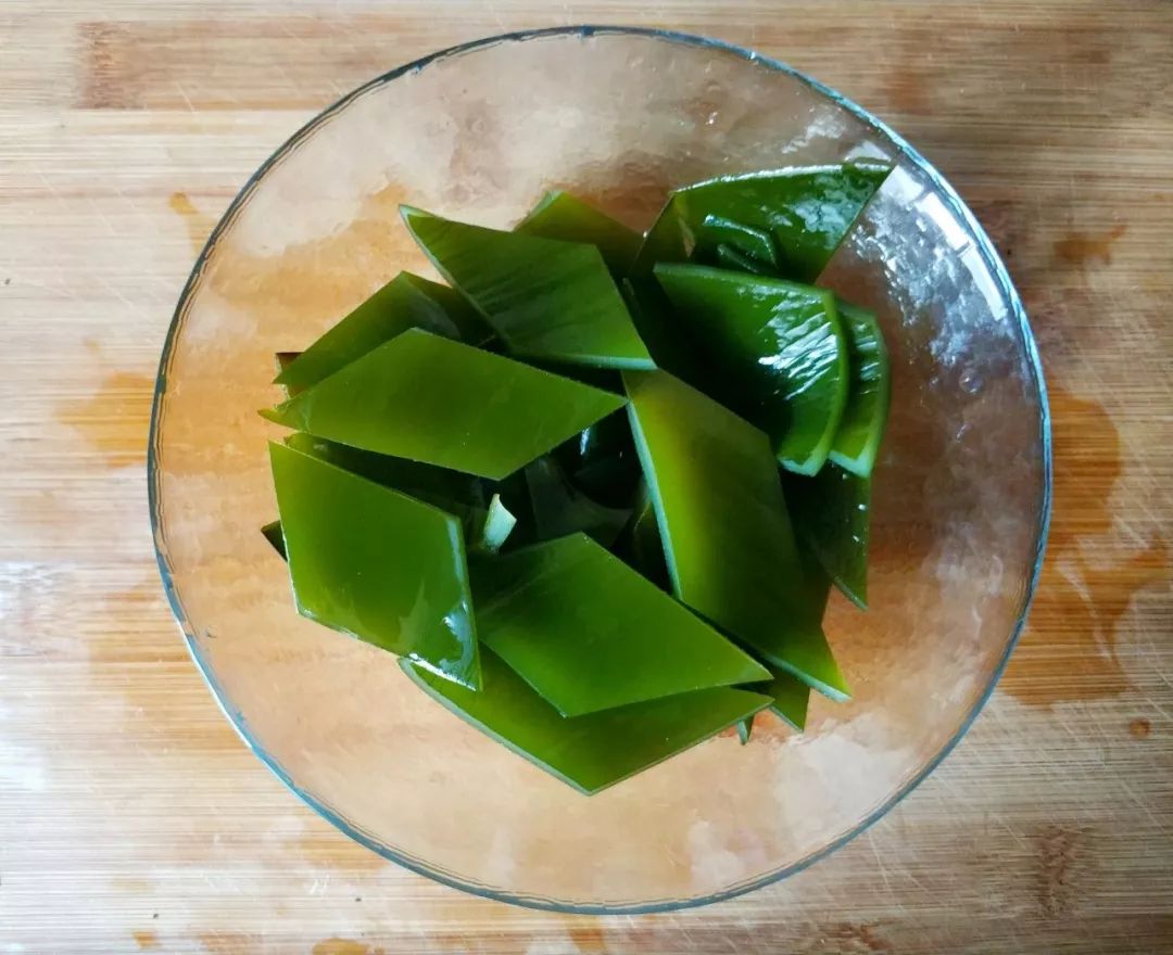 3、放入海带,倒入1少料酒,翻炒至水汽升腾,锅中腥气也随之挥发;