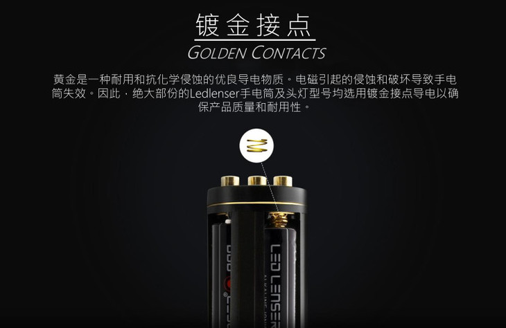 黄金是一种耐用和抗化学侵蚀的优良导电物质。电磁引起的侵蚀和破坏导致手电筒失效。因此,绝大部份的Ledlenser手电筒及头灯型号均选用镀金接点导电以确保产品质量和耐用性。