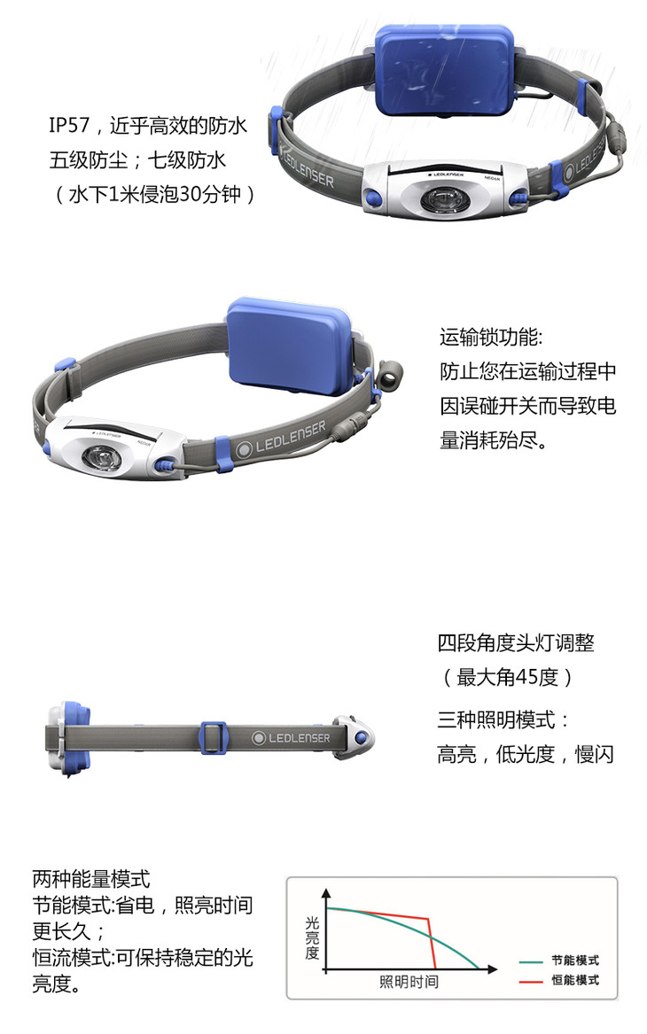 Ledlenser某些型號(如: MT6, MT10, NEO10R, NEO6R, NEO4, MH8等)内置了两种电量模式恒流模式 和 节能模式,让使用者可按不同环境情况和实際需要切換至不同的电量管理模式。