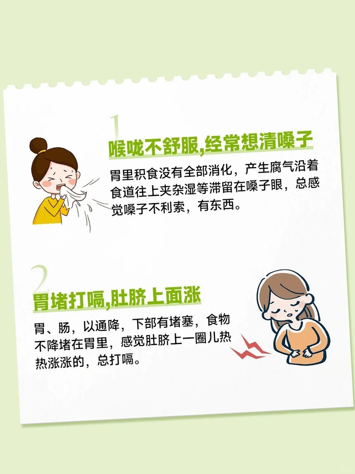 表现:食欲较差,吃一点东西就涨,想打嗝没力气……