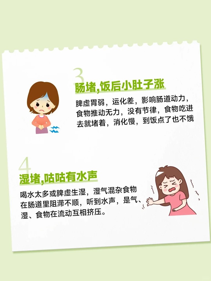 表现:食欲好,打嗝酸腐、脸和头油得快、肚子凸……