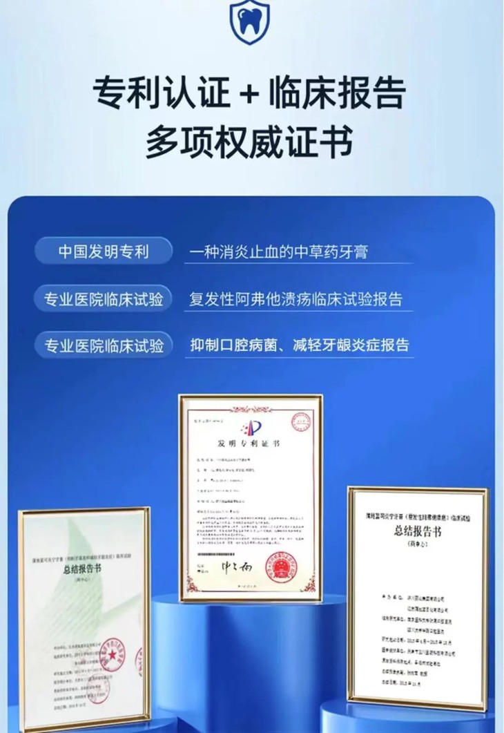 中医古方+现代科技成分,能够温和的修复口腔,同时不会刺激已受损的口腔黏膜,综合性的解决牙齿、口腔的问题。同时也是经过了专利认可!