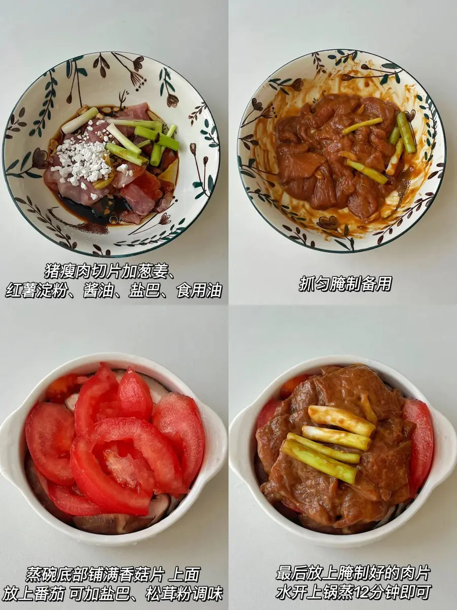 2️⃣蒸碗底部铺满香菇片 上面放上番茄 可加盐巴、松茸粉调味