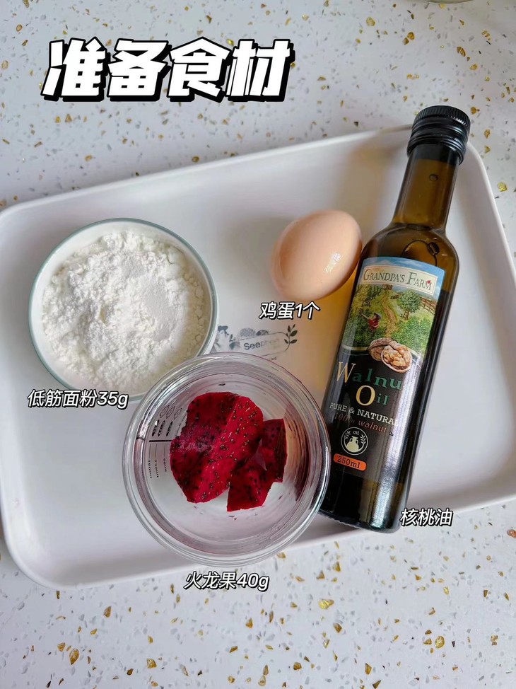 准备食材:鸡蛋1个 低筋面粉35g 火龙果40g 核桃油