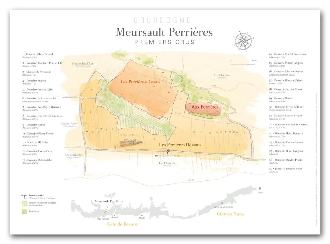 在默尔索十几个一级园中,公认村庄南端的三大超一级园有着可以媲美特级园的品质:Charmes、Genevrières和Perrières。