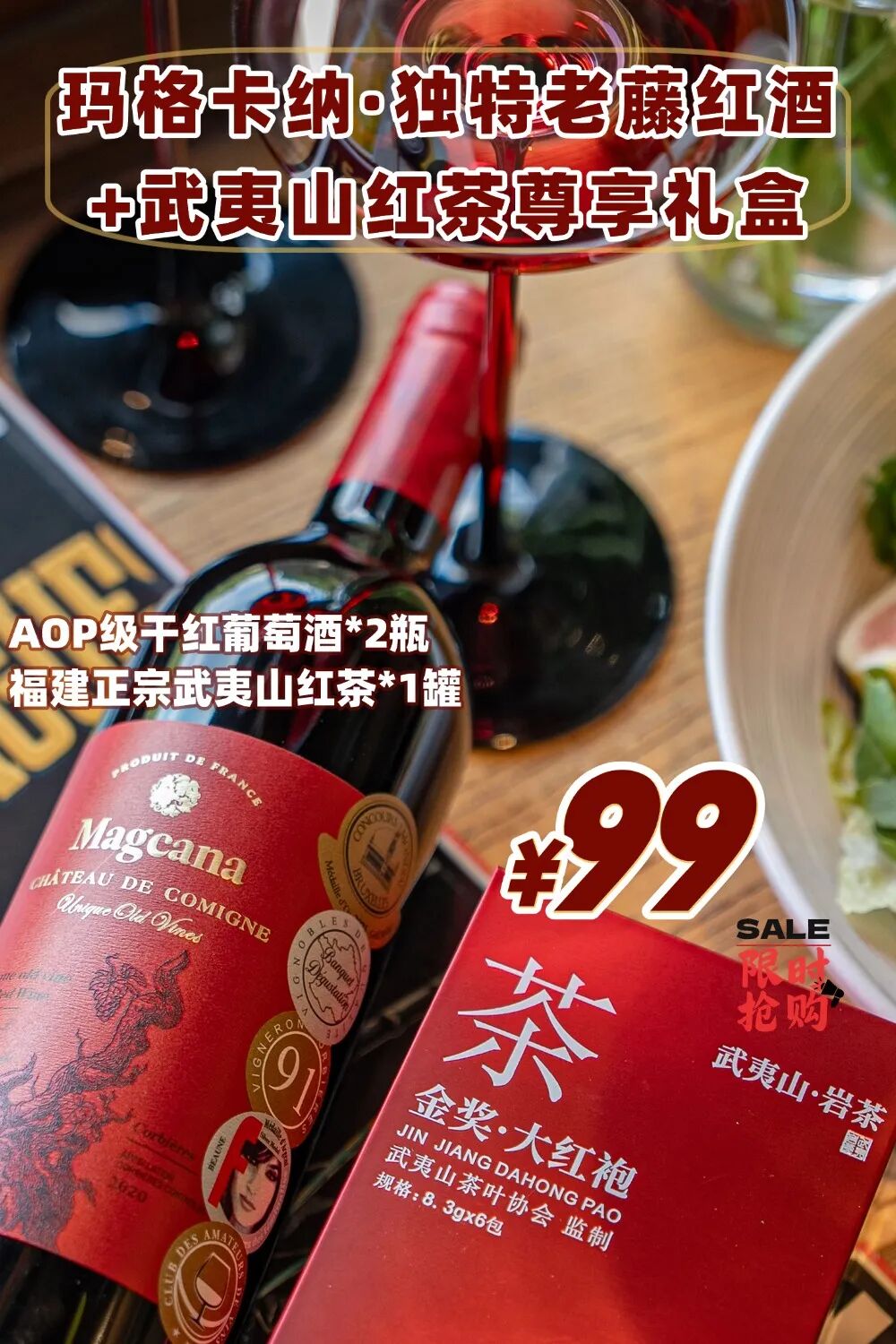 今天推文价仅需:99元/提/2支法国原瓶AOP干红+武夷大红袍1罐,礼盒装福利特惠!