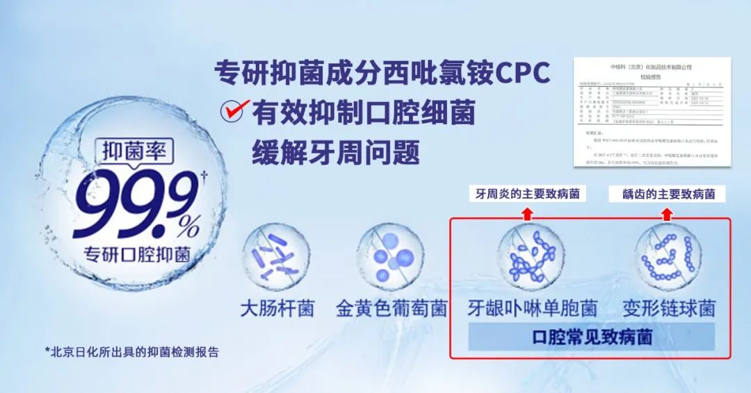 呼嘎不断升级漱口水的基础配方——0酒精不刺激,到天然精油调香,再到蛀牙、牙周特异性致病菌抑菌效果测试,以及不含12种防腐剂……
