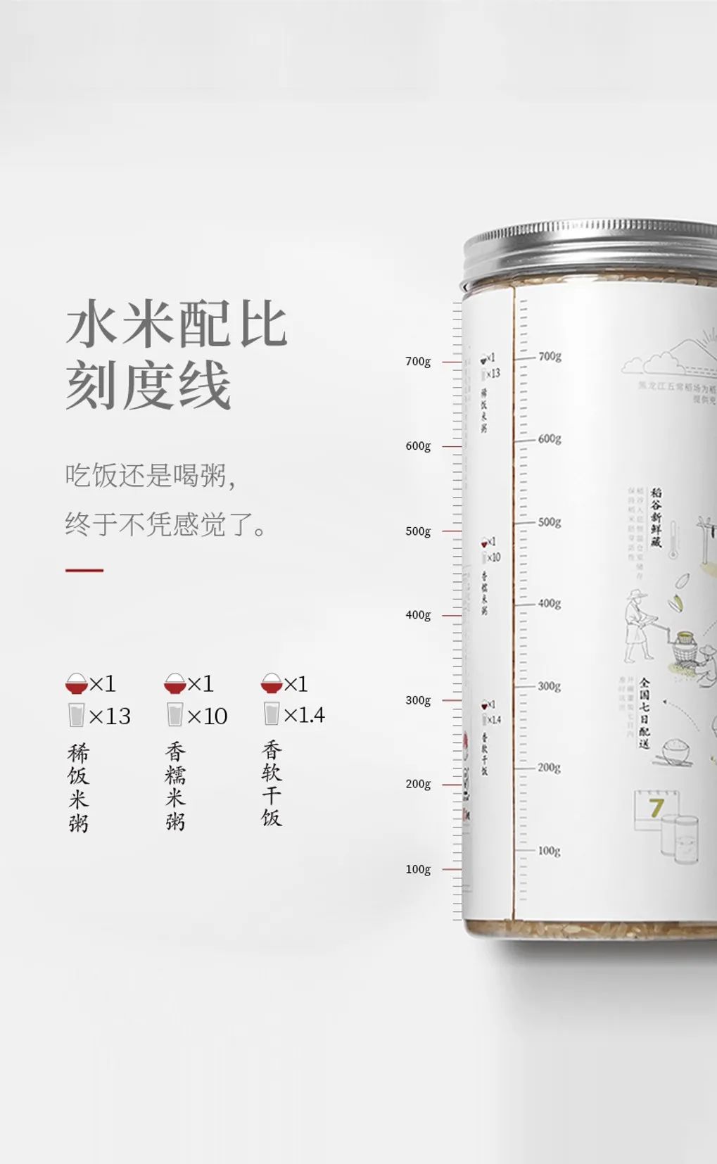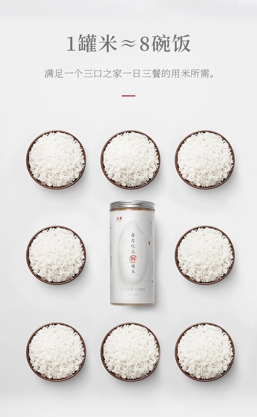 因此我们将每罐米的净含量控制在800g,800g米约等于8碗饭,满足一个三口之家一日三餐的用米所需,减少浪费。