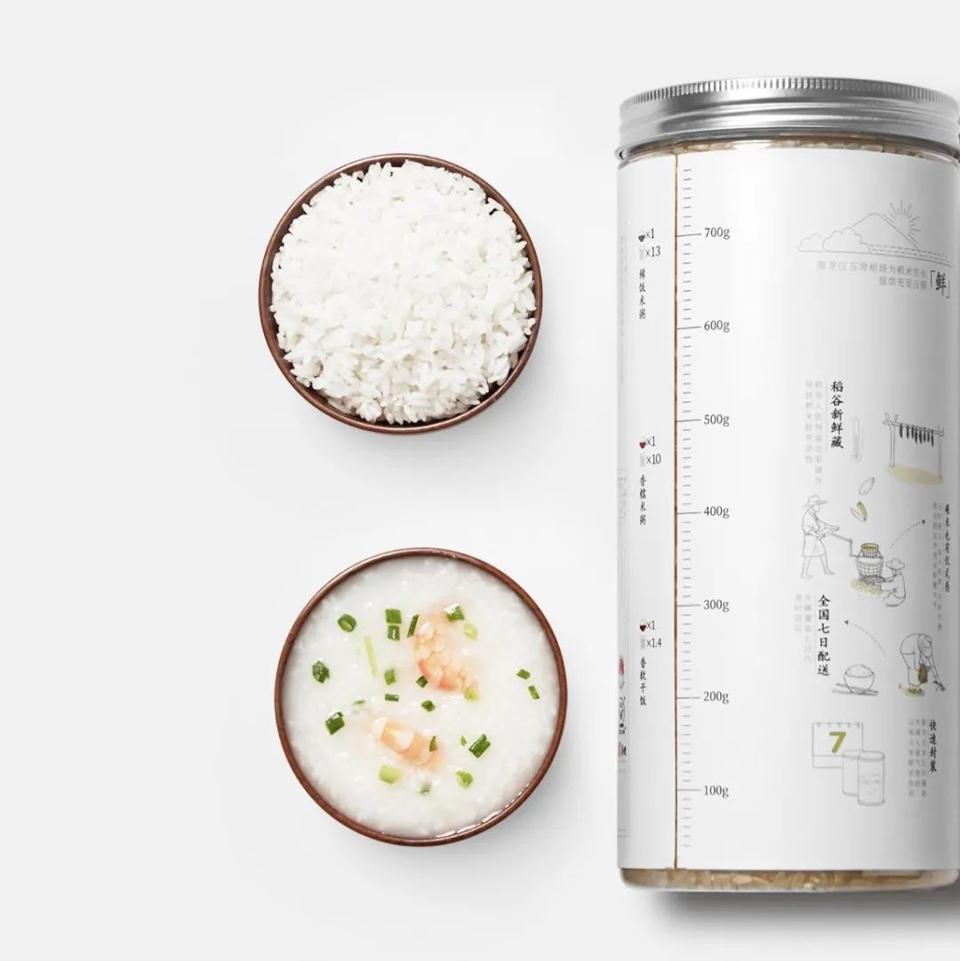 传统的包装模式,太笨重了。我们参考了《中国居民膳食指南2016》,一个成年人一天大概需要摄入250-400g的粮食(大米),那一家三口则大概需要600-800g。