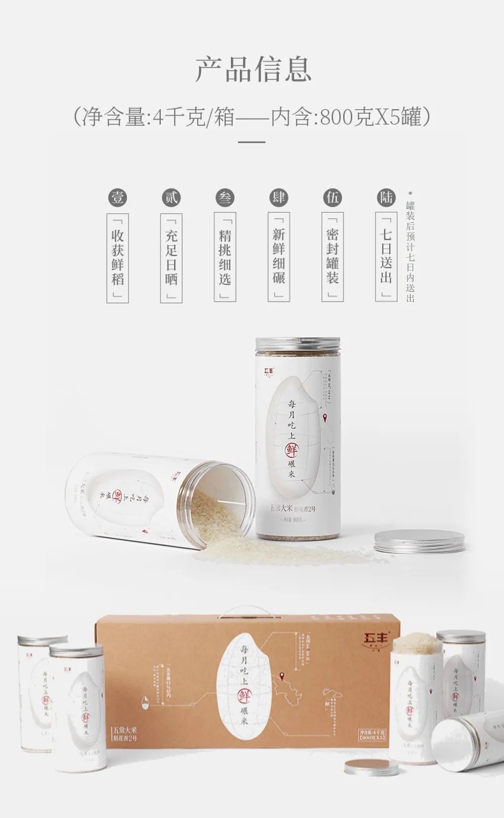 这款“鲜碾米”,一提有5罐,每罐800克,一共4公斤。