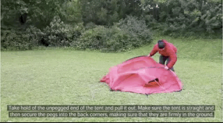 站在上风向,随风展开地步,用地钉依次固定四角;